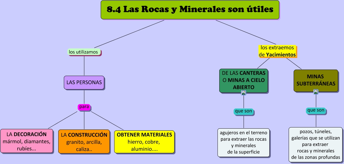 Este Cmap, tiene información relacionada con: 8.4 Las rocas y minerales son útiles, DE LAS CANTERAS O MINAS A CIELO ABIERTO que son agujeros en el terreno para extraer las rocas y minerales de la superficie, 8.4 Las Rocas y Minerales son útiles los extraemos de Yacimientos DE LAS CANTERAS O MINAS A CIELO ABIERTO, LAS PERSONAS para LA DECORACIÓN mármol, diamantes, rubíes..., 8.4 Las Rocas y Minerales son útiles los utilizamos LAS PERSONAS, LAS PERSONAS para OBTENER MATERIALES hierro, cobre, aluminio...., 8.4 Las Rocas y Minerales son útiles los extraemos de Yacimientos MINAS SUBTERR�?NEAS, LAS PERSONAS para LA CONSTRUCCIÓN granito, arcilla, caliza.., MINAS SUBTERR�?NEAS que son pozos, túneles, galerías que se utilizan para extraer rocas y minerales de las zonas profundas