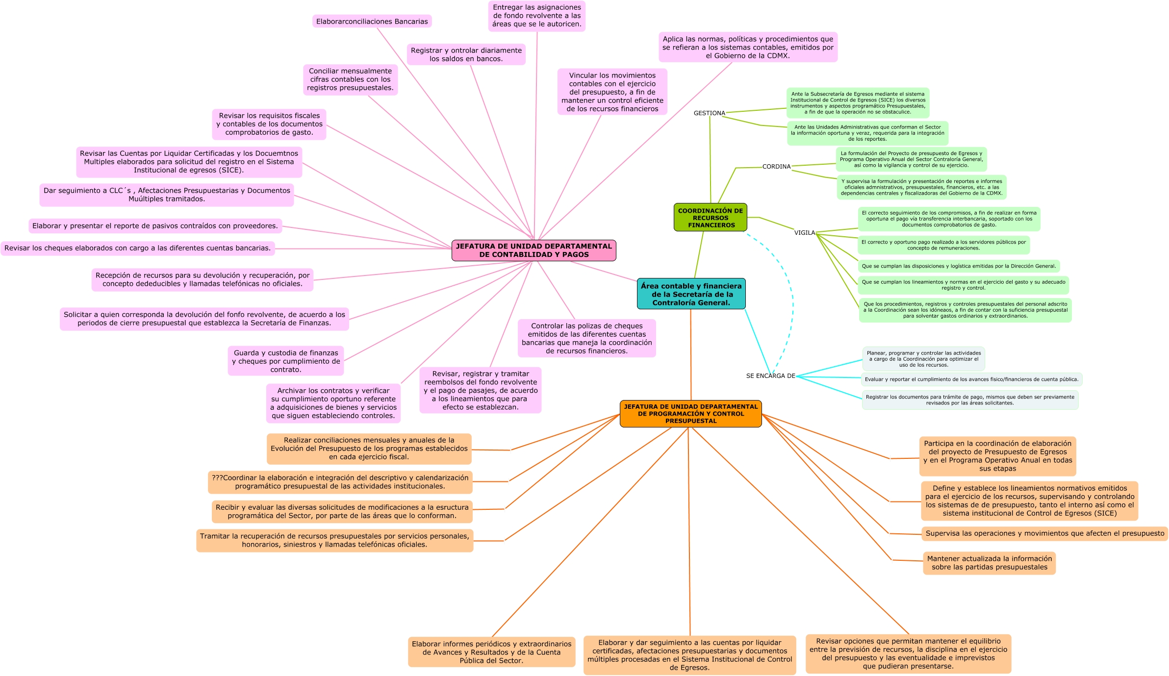 Este Cmap, tiene información relacionada con: ACTIVIDAD 2 UNIDAD 3, COORDINACIÓN DE RECURSOS FINANCIEROS GESTIONA Ante la Subsecretaría de Egresos mediante el sistema Institucional de Control de Egresos (SICE) los diversos instrumentos y aspectos programático Presupuestales, a fin de que la operación no se obstaculice., JEFATURA DE UNIDAD DEPARTAMENTAL DE CONTABILIDAD Y PAGOS Conciliar mensualmente cifras contables con los registros presupuestales., JEFATURA DE UNIDAD DEPARTAMENTAL DE CONTABILIDAD Y PAGOS Revisar los requisitos fiscales y contables de los documentos comprobatorios de gasto., JEFATURA DE UNIDAD DEPARTAMENTAL DE PROGRAMACIÓN Y CONTROL PRESUPUESTAL Realizar conciliaciones mensuales y anuales de la Evolución del Presupuesto de los programas establecidos en cada ejercicio fiscal., JEFATURA DE UNIDAD DEPARTAMENTAL DE CONTABILIDAD Y PAGOS Elaborarconciliaciones Bancarias, JEFATURA DE UNIDAD DEPARTAMENTAL DE PROGRAMACIÓN Y CONTROL PRESUPUESTAL ???Coordinar la elaboración e integración del descriptivo y calendarización programático presupuestal de las actividades institucionales., JEFATURA DE UNIDAD DEPARTAMENTAL DE PROGRAMACIÓN Y CONTROL PRESUPUESTAL Recibir y evaluar las diversas solicitudes de modificaciones a la esructura programática del Sector, por parte de las áreas que lo conforman., JEFATURA DE UNIDAD DEPARTAMENTAL DE CONTABILIDAD Y PAGOS Revisar las Cuentas por Liquidar Certificadas y los Docuemtnos Multiples elaborados para solicitud del registro en el Sistema Institucional de egresos (SICE)., JEFATURA DE UNIDAD DEPARTAMENTAL DE CONTABILIDAD Y PAGOS Aplica las normas, políticas y procedimientos que se refieran a los sistemas contables, emitidos por el Gobierno de la CDMX., JEFATURA DE UNIDAD DEPARTAMENTAL DE CONTABILIDAD Y PAGOS Revisar, registrar y tramitar reembolsos del fondo revolvente y el pago de pasajes, de acuerdo a los lineamientos que para efecto se establezcan., JEFATURA DE UNIDAD DEPARTAMENTAL DE PROGRAMACIÓN Y CONTROL PRESUPUESTAL Supervisa las operaciones y movimientos que afecten el presupuesto, JEFATURA DE UNIDAD DEPARTAMENTAL DE CONTABILIDAD Y PAGOS Revisar los cheques elaborados con cargo a las diferentes cuentas bancarias., COORDINACIÓN DE RECURSOS FINANCIEROS CORDINA La formulación del Proyecto de presupuesto de Egresos y Programa Operativo Anual del Sector Contraloría General, así como la vigilancia y control de su ejercicio., Área contable y financiera de la Secretaría de la Contraloría General. SE ENCARGA DE Evaluar y reportar el cumplimiento de los avances fisico/financieros de cuenta pública., JEFATURA DE UNIDAD DEPARTAMENTAL DE CONTABILIDAD Y PAGOS Controlar las polizas de cheques emitidos de las diferentes cuentas bancarias que maneja la coordinación de recursos financieros., COORDINACIÓN DE RECURSOS FINANCIEROS VIGILA Que se cumplan los lineamientos y normas en el ejercicio del gasto y su adecuado registro y control., JEFATURA DE UNIDAD DEPARTAMENTAL DE CONTABILIDAD Y PAGOS Vincular los movimientos contables con el ejercicio del presupuesto, a fin de mantener un control eficiente de los recursos financieros, COORDINACIÓN DE RECURSOS FINANCIEROS VIGILA El correcto seguimiento de los compromisos, a fin de realizar en forma oportuna el pago vía transferencia interbancaria, soportado con los documentos comprobatorios de gasto., JEFATURA DE UNIDAD DEPARTAMENTAL DE PROGRAMACIÓN Y CONTROL PRESUPUESTAL Área contable y financiera de la Secretaría de la Contraloría General., JEFATURA DE UNIDAD DEPARTAMENTAL DE PROGRAMACIÓN Y CONTROL PRESUPUESTAL Revisar opciones que permitan mantener el equilibrio entre la previsión de recursos, la disciplina en el ejercicio del presupuesto y las eventualidade e imprevistos que pudieran presentarse.