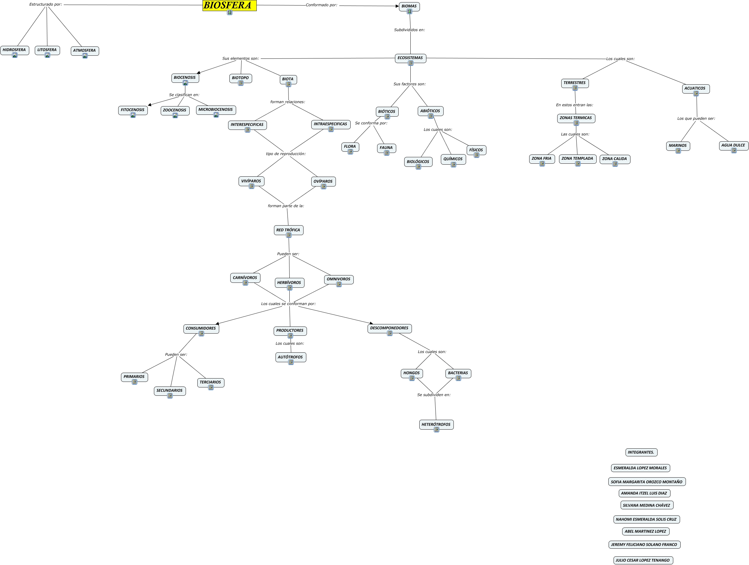 Este Cmap, tiene información relacionada con: MAPA CONCEPTUAL, BIOTA forman relaciones: INTERESPECIFICAS, BIOSFERA Estructurado por: ATMOSFERA, PRODUCTORES Los cuales son: AUTÓTROFOS, INTERESPECIFICAS tipo de reproducción: VIVÍPAROS, ABIÓTICOS Los cuales son: FÍSICOS, HERBÍVOROS Los cuales se conforman por: PRODUCTORES, ZONAS TERMICAS Las cuales son: ZONA CALIDA, ZONAS TERMICAS Las cuales son: ZONA FRIA, BIOSFERA Estructurado por: LITOSFERA, ECOSISTEMAS Sus elementos son: BIOCENOSIS, CARNÍVOROS Los cuales se conforman por: CONSUMIDORES, BIOSFERA Estructurado por: HIDROSFERA, DESCOMPONEDORES Los cuales son: HONGOS, ACUATICOS Los que pueden ser: MARINOS, OMNIVOROS Los cuales se conforman por: DESCOMPONEDORES, INTRAESPECIFICAS tipo de reproducción: VIVÍPAROS, ACUATICOS Los que pueden ser: AGUA DULCE, ECOSISTEMAS Sus elementos son: BIOTOPO, RED TRÓFICA Pueden ser: OMNIVOROS, RED TRÓFICA Pueden ser: HERBÍVOROS