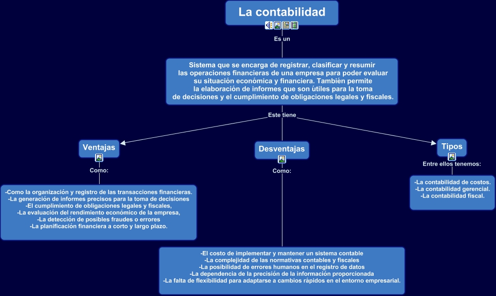 Este Cmap, tiene información relacionada con: La contabilidad, Sistema que se encarga de registrar, clasificar y resumir las operaciones financieras de una empresa para poder evaluar su situación económica y financiera. También permite la elaboración de informes que son útiles para la toma de decisiones y el cumplimiento de obligaciones legales y fiscales. Este tiene Tipos, La contabilidad Es un Sistema que se encarga de registrar, clasificar y resumir las operaciones financieras de una empresa para poder evaluar su situación económica y financiera. También permite la elaboración de informes que son útiles para la toma de decisiones y el cumplimiento de obligaciones legales y fiscales., Ventajas Como: -Como la organización y registro de las transacciones financieras. -La generación de informes precisos para la toma de decisiones -El cumplimiento de obligaciones legales y fiscales, -La evaluación del rendimiento económico de la empresa, -La detección de posibles fraudes o errores -La planificación financiera a corto y largo plazo., Desventajas Como: -El costo de implementar y mantener un sistema contable -La complejidad de las normativas contables y fiscales -La posibilidad de errores humanos en el registro de datos -La dependencia de la precisión de la información proporcionada -La falta de flexibilidad para adaptarse a cambios rápidos en el entorno empresarial., Sistema que se encarga de registrar, clasificar y resumir las operaciones financieras de una empresa para poder evaluar su situación económica y financiera. También permite la elaboración de informes que son útiles para la toma de decisiones y el cumplimiento de obligaciones legales y fiscales. Este tiene Ventajas, Sistema que se encarga de registrar, clasificar y resumir las operaciones financieras de una empresa para poder evaluar su situación económica y financiera. También permite la elaboración de informes que son útiles para la toma de decisiones y el cumplimiento de obligaciones legales y fiscales. Este tiene Desventajas, Tipos Entre ellos tenemos: -La contabilidad de costos. -La contabilidad gerencial. -La contabilidad fiscal.