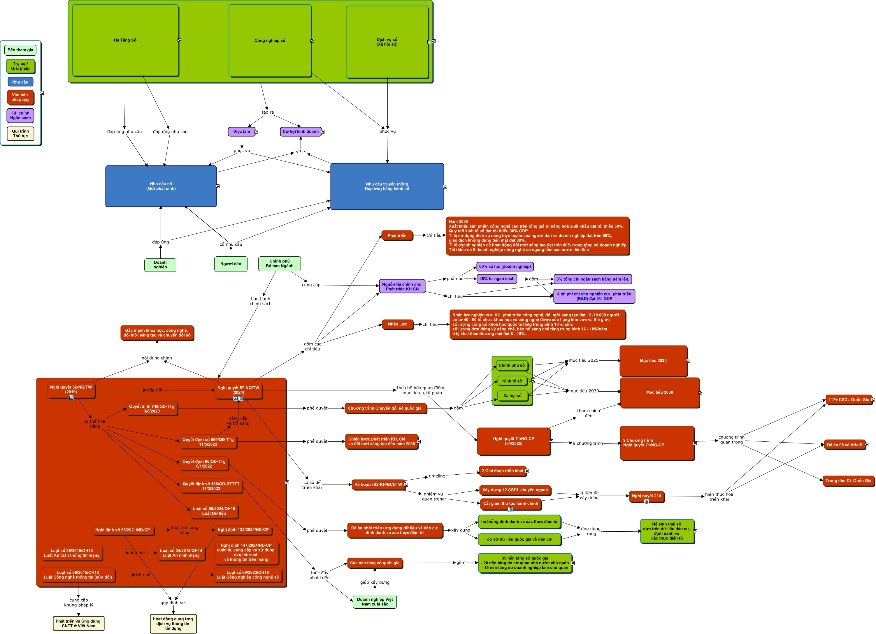 This Concept Map, created with IHMC CmapTools, has information related to: CMC TS Chính sách CP Kinh tế số, Kế hoạch 02-KH/BCDTW nhiệm vụ quan trọng Cắt giảm thủ tục hành chính, Việc làm phục vụ Nhu cầu truyền thống Đáp ứng bằng kênh số, dịch vụ công trực tuyến mục tiêu Mục tiêu 23-25, Xã hội số mục tiêu 2030 Chính phủ số: + 100% dịch vụ công trực tuyến mức độ 4; + 100% hồ sơ công việc tại cấp bộ, tỉnh và 90% tại cấp huyện, 0% tại cấp xã được xử lý trên môi trường mạng + 100% chế độ báo cáo, chỉ tiêu tổng hợp báo cáo định kỳ và báo cáo thống kê về kinh tế - xã hội của Chính phủ, Thủ tướng Chính phủ được kết nối, tích hợp, chia sẻ dữ liệu số trên Hệ thống thông tin báo cáo Chính phủ. + 100% CSDL quốc gia (Dân cư, Đất đai, Đăng ký doanh nghiệp, Tài chính, Bảo hiểm, được hoàn thành và kết nối, chia sẻ trên toàn quốc + 70% hoạt động kiểm tra của cơ quan quản lý nhà nước được thực hiện thông qua môi trường số + Việt Nam thuộc nhóm 50 nước dẫn đầu về Chính phủ điện tử (EGDI), Nhu cầu truyền thống Đáp ứng bằng kênh số tạo ra Cơ hội kinh doanh, Nghị quyết 57-NQ/TW (2024) gồm các chỉ tiêu Nguồn tài chính cho Phát triẻn KH CN, dịch vụ công trực tuyến mục tiêu Mục tiêu 25-30, Dịch vụ công trực tuyến (E-government) phục vụ Nhu cầu truyền thống Đáp ứng bằng kênh số, tiện ích phục vụ công dân số mục tiêu Mục tiêu 2022, Nghị quyết 52-NQ/TW (2019) cụ thể hóa bằng Quyết định 06/QĐ-TTg 6/1/2022, Nguồn tài chính cho Phát triẻn KH CN chỉ tiêu Kinh phí chi cho nghiên cứu phát triển (R&D) đạt 2% GDP, Quyết định số 569/QĐ-TTg 11/5/2022 nâng cấp và bổ sung Nghị quyết 57-NQ/TW (2024), Xã hội số mục tiêu 2030 + Kinh tế số chiếm 30% GDP; + Tỷ trọng kinh tế số trong từng ngành, lĩnh vực đạt tối thiểu 20% + Năng suất lao động hàng năm tăng tối thiểu 8% GDP; - Việt Nam thuộc nhóm 30 nước dẫn đầu về công nghệ thông tin (IDI); - Việt Nam thuộc nhóm 30 nước dẫn đầu về chỉ số cạnh tranh (GCI); - Việt Nam thuộc nhóm 30 nước dẫn đầu về đổi mới sáng tạo (GII)., Nguồn tài chính cho Phát triẻn KH CN chỉ tiêu 3% tổng chi ngân sách hằng năm iển., Nghị định số 58/2021/NĐ-CP được bổ sung bằng Nghị định 133/2024/NĐ-CP, Các nền tảng số quốc gia gồm 35 nền tảng số quốc gia - 20 nền tảng do cơ quan nhà nước chủ quản - 15 nền tảng do doanh nghiệp làm chủ quản, Kinh tế số mục tiêu 2025 - Kinh tế số chiếm 20% GDP; - Tỷ trọng kinh tế số trong từng ngành, lĩnh vực đạt tối thiểu 10%; - Năng suất lao động hàng năm tăng tối thiểu 7%; - Việt Nam thuộc nhóm 50 nước dẫn đầu về công nghệ thông tin (IDI); - Việt Nam thuộc nhóm 50 nước dẫn đầu về chỉ số cạnh tranh (GCI); - Việt Nam thuộc nhóm 35 nước dẫn đầu về đổi mới sáng tạo (GII)., Nghị quyết 52-NQ/TW (2019) cụ thể hóa bằng Quyết định số 186/QĐ-BTTTT 11/2/2022, Doanh nghiệp đáp ứng Nhu cầu truyền thống Đáp ứng bằng kênh số, Người dân có nhu cầu Sử dụng các nền tảng số triệu người dùng