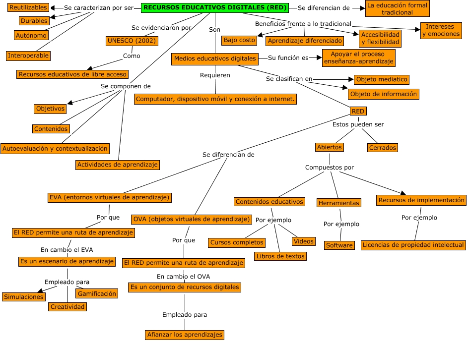 Este Cmap, tiene información relacionada con: RECURSOS EDUCATIVOS DIGITALES, EVA (entornos virtuales de aprendizaje) Por que El RED permite una ruta de aprendizaje, Es un escenario de aprendizaje Empleado para Gamificación, RECURSOS EDUCATIVOS DIGITALES (RED) Son Medios educativos digitales, Medios educativos digitales Se clasifican en RED, UNESCO (2002) Como Recursos educativos de libre acceso, RECURSOS EDUCATIVOS DIGITALES (RED) Beneficios frente a lo tradicional Accesibilidad y flexibilidad, Abiertos Compuestos por Contenidos educativos, RED Se diferencian de OVA (objetos virtuales de aprendizaje), RECURSOS EDUCATIVOS DIGITALES (RED) Se caracterizan por ser Autónomo, RECURSOS EDUCATIVOS DIGITALES (RED) Beneficios frente a lo tradicional Bajo costo, RECURSOS EDUCATIVOS DIGITALES (RED) Se caracterizan por ser Durables, Contenidos educativos Por ejemplo Videos, RECURSOS EDUCATIVOS DIGITALES (RED) Se componen de Contenidos, RED Estos pueden ser Abiertos, El RED permite una ruta de aprendizaje En cambio el OVA Es un conjunto de recursos digitales, RECURSOS EDUCATIVOS DIGITALES (RED) Se diferencian de La educación formal tradicional, Es un escenario de aprendizaje Empleado para Simulaciones, Medios educativos digitales Su función es Apoyar el proceso enseñanza-aprendizaje, RECURSOS EDUCATIVOS DIGITALES (RED) Beneficios frente a lo tradicional Intereses y emociones, RECURSOS EDUCATIVOS DIGITALES (RED) Se caracterizan por ser Reutilizables