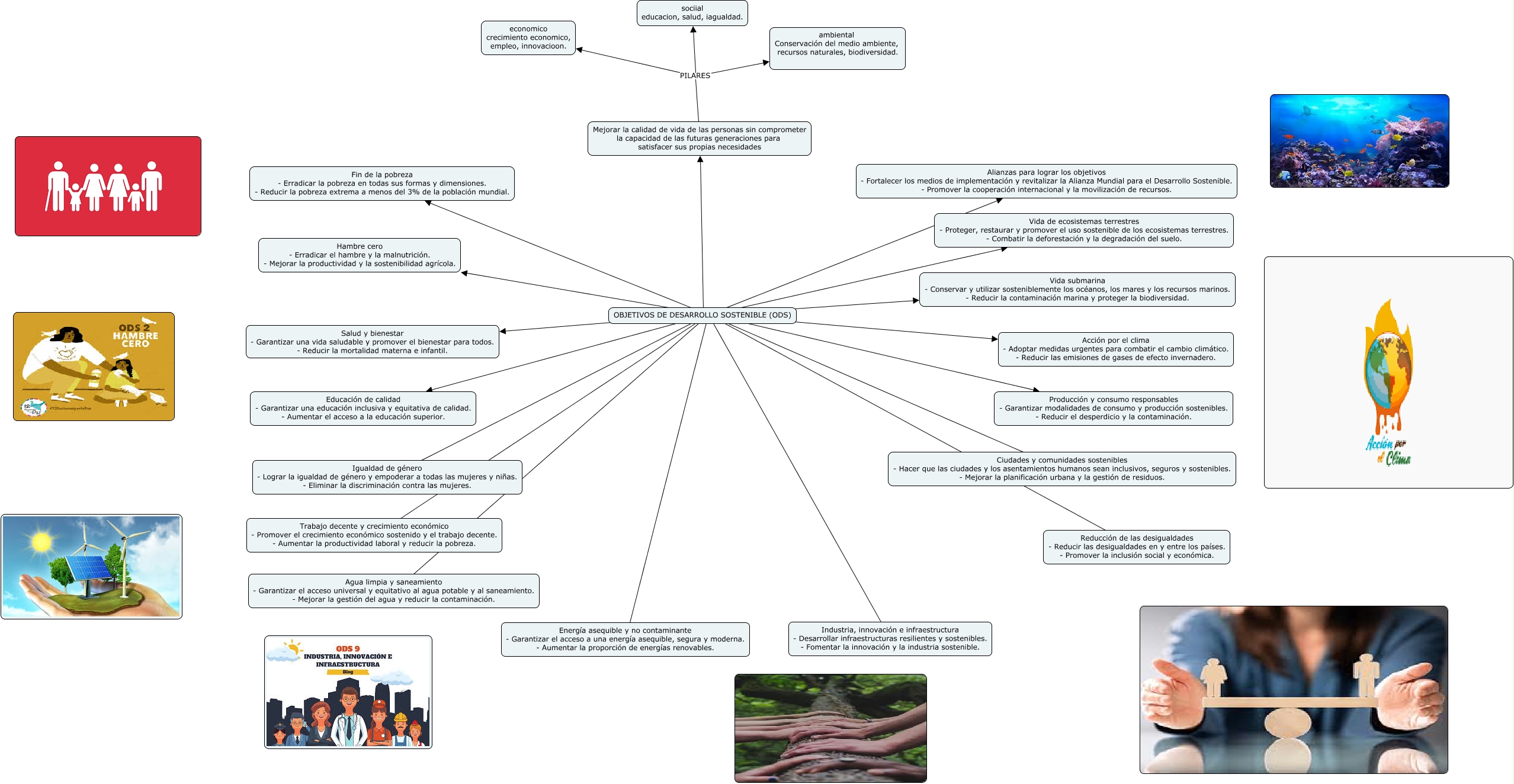 Este Cmap, tiene información relacionada con: ODJETIBOS DE DESARROLLO SOSTENIBLE, OBJETIVOS DE DESARROLLO SOSTENIBLE (ODS) ???? Industria, innovación e infraestructura - Desarrollar infraestructuras resilientes y sostenibles. - Fomentar la innovación y la industria sostenible., OBJETIVOS DE DESARROLLO SOSTENIBLE (ODS) ???? Educación de calidad - Garantizar una educación inclusiva y equitativa de calidad. - Aumentar el acceso a la educación superior., OBJETIVOS DE DESARROLLO SOSTENIBLE (ODS) ???? Producción y consumo responsables - Garantizar modalidades de consumo y producción sostenibles. - Reducir el desperdicio y la contaminación., Mejorar la calidad de vida de las personas sin comprometer la capacidad de las futuras generaciones para satisfacer sus propias necesidades PILARES ambiental Conservación del medio ambiente, recursos naturales, biodiversidad., OBJETIVOS DE DESARROLLO SOSTENIBLE (ODS) ???? Igualdad de género - Lograr la igualdad de género y empoderar a todas las mujeres y niñas. - Eliminar la discriminación contra las mujeres., OBJETIVOS DE DESARROLLO SOSTENIBLE (ODS) ???? Salud y bienestar - Garantizar una vida saludable y promover el bienestar para todos. - Reducir la mortalidad materna e infantil., OBJETIVOS DE DESARROLLO SOSTENIBLE (ODS) ???? Trabajo decente y crecimiento económico - Promover el crecimiento económico sostenido y el trabajo decente. - Aumentar la productividad laboral y reducir la pobreza., OBJETIVOS DE DESARROLLO SOSTENIBLE (ODS) ???? Agua limpia y saneamiento - Garantizar el acceso universal y equitativo al agua potable y al saneamiento. - Mejorar la gestión del agua y reducir la contaminación., OBJETIVOS DE DESARROLLO SOSTENIBLE (ODS) ???? Acción por el clima - Adoptar medidas urgentes para combatir el cambio climático. - Reducir las emisiones de gases de efecto invernadero., OBJETIVOS DE DESARROLLO SOSTENIBLE (ODS) ???? Hambre cero - Erradicar el hambre y la malnutrición. - Mejorar la productividad y la sostenibilidad agrícola., OBJETIVOS DE DESARROLLO SOSTENIBLE (ODS) ???? Fin de la pobreza - Erradicar la pobreza en todas sus formas y dimensiones. - Reducir la pobreza extrema a menos del 3% de la población mundial., Mejorar la calidad de vida de las personas sin comprometer la capacidad de las futuras generaciones para satisfacer sus propias necesidades PILARES sociial educacion, salud, iagualdad., OBJETIVOS DE DESARROLLO SOSTENIBLE (ODS) ???? Alianzas para lograr los objetivos - Fortalecer los medios de implementación y revitalizar la Alianza Mundial para el Desarrollo Sostenible. - Promover la cooperación internacional y la movilización de recursos., OBJETIVOS DE DESARROLLO SOSTENIBLE (ODS) ???? Vida de ecosistemas terrestres - Proteger, restaurar y promover el uso sostenible de los ecosistemas terrestres. - Combatir la deforestación y la degradación del suelo., Mejorar la calidad de vida de las personas sin comprometer la capacidad de las futuras generaciones para satisfacer sus propias necesidades PILARES economico crecimiento economico, empleo, innovacioon., OBJETIVOS DE DESARROLLO SOSTENIBLE (ODS) ???? Ciudades y comunidades sostenibles - Hacer que las ciudades y los asentamientos humanos sean inclusivos, seguros y sostenibles. - Mejorar la planificación urbana y la gestión de residuos., OBJETIVOS DE DESARROLLO SOSTENIBLE (ODS) ???? Vida submarina - Conservar y utilizar sosteniblemente los océanos, los mares y los recursos marinos. - Reducir la contaminación marina y proteger la biodiversidad., OBJETIVOS DE DESARROLLO SOSTENIBLE (ODS) ???? Reducción de las desigualdades - Reducir las desigualdades en y entre los países. - Promover la inclusión social y económica., OBJETIVOS DE DESARROLLO SOSTENIBLE (ODS) ???? Energía asequible y no contaminante - Garantizar el acceso a una energía asequible, segura y moderna. - Aumentar la proporción de energías renovables., OBJETIVOS DE DESARROLLO SOSTENIBLE (ODS) Mejorar la calidad de vida de las personas sin comprometer la capacidad de las futuras generaciones para satisfacer sus propias necesidades
