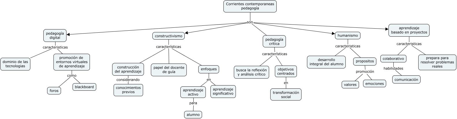 Este Cmap, tiene información relacionada con: Corrientes contemporaneas, enfoques en aprendizaje activo, pedagogía digital caracteristicas promoción de entornos virtuales de aprendizaje, promoción de entornos virtuales de aprendizaje como foros, pedagogía crítica características busca la reflexión y análisis crítico, propositos promoción valores, promoción de entornos virtuales de aprendizaje como blackboard, objetivos centrados en transformación social, aprendizaje basado en proyectos caracteristicas colaborativo, constructivismo características construcción del aprendizaje, propositos promoción emociones, Corrientes contemporaneas pedagogía son aprendizaje basado en proyectos, enfoques en aprendizaje significativo, pedagogía crítica características objetivos centrados, colaborativo habilidades comunicación, constructivismo características papel del docente de guía, constructivismo características enfoques, Corrientes contemporaneas pedagogía son humanismo, humanismo caracteristicas propositos, aprendizaje activo para alumno, Corrientes contemporaneas pedagogía son constructivismo