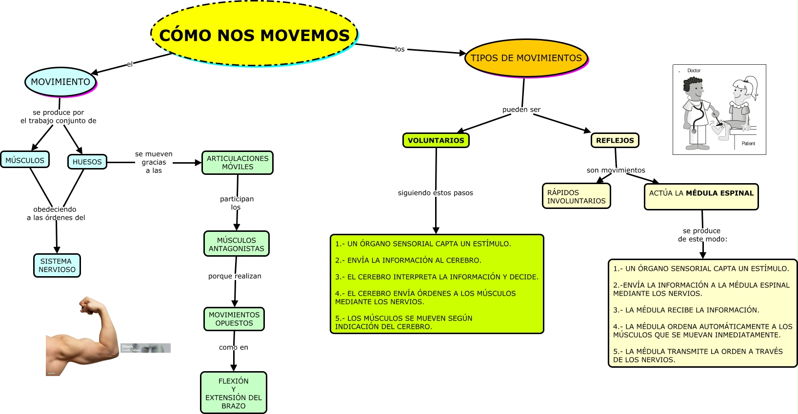 Este Cmap, tiene información relacionada con: CÓMO NOS MOVEMOS, MOVIMIENTOS OPUESTOS como en FLEXIÓN Y EXTENSIÓN DEL BRAZO, CÓMO NOS MOVEMOS el MOVIMIENTO, ARTICULACIONES MÓVILES participan los MÚSCULOS ANTAGONISTAS, REFLEJOS son movimientos RÁPIDOS INVOLUNTARIOS, HUESOS se mueven gracias a las ARTICULACIONES MÓVILES, VOLUNTARIOS siguiendo estos pasos 1.- UN ÓRGANO SENSORIAL CAPTA UN ESTÍMULO. 2.- ENVÍA LA INFORMACIÓN AL CEREBRO. 3.- EL CEREBRO INTERPRETA LA INFORMACIÓN Y DECIDE. 4.- EL CEREBRO ENVÍA ÓRDENES A LOS MÚSCULOS MEDIANTE LOS NERVIOS. 5.- LOS MÚSCULOS SE MUEVEN SEGÚN INDICACIÓN DEL CEREBRO., TIPOS DE MOVIMIENTOS pueden ser REFLEJOS, MÚSCULOS ANTAGONISTAS porque realizan MOVIMIENTOS OPUESTOS, HUESOS obedeciendo a las órdenes del SISTEMA NERVIOSO, TIPOS DE MOVIMIENTOS pueden ser VOLUNTARIOS, CÓMO NOS MOVEMOS los TIPOS DE MOVIMIENTOS, ACTÚA LA MÉDULA ESPINAL se produce de este modo: 1.- UN ÓRGANO SENSORIAL CAPTA UN ESTÍMULO. 2.-ENVÍA LA INFORMACIÓN A LA MÉDULA ESPINAL MEDIANTE LOS NERVIOS. 3.- LA MÉDULA RECIBE LA INFORMACIÓN. 4.- LA MÉDULA ORDENA AUTOMÁTICAMENTE A LOS MÚSCULOS QUE SE MUEVAN INMEDIATAMENTE. 5.- LA MÉDULA TRANSMITE LA ORDEN A TRAVÉS DE LOS NERVIOS., MÚSCULOS obedeciendo a las órdenes del SISTEMA NERVIOSO, MOVIMIENTO se produce por el trabajo conjunto de HUESOS, MOVIMIENTO se produce por el trabajo conjunto de MÚSCULOS, REFLEJOS son movimientos ACTÚA LA MÉDULA ESPINAL