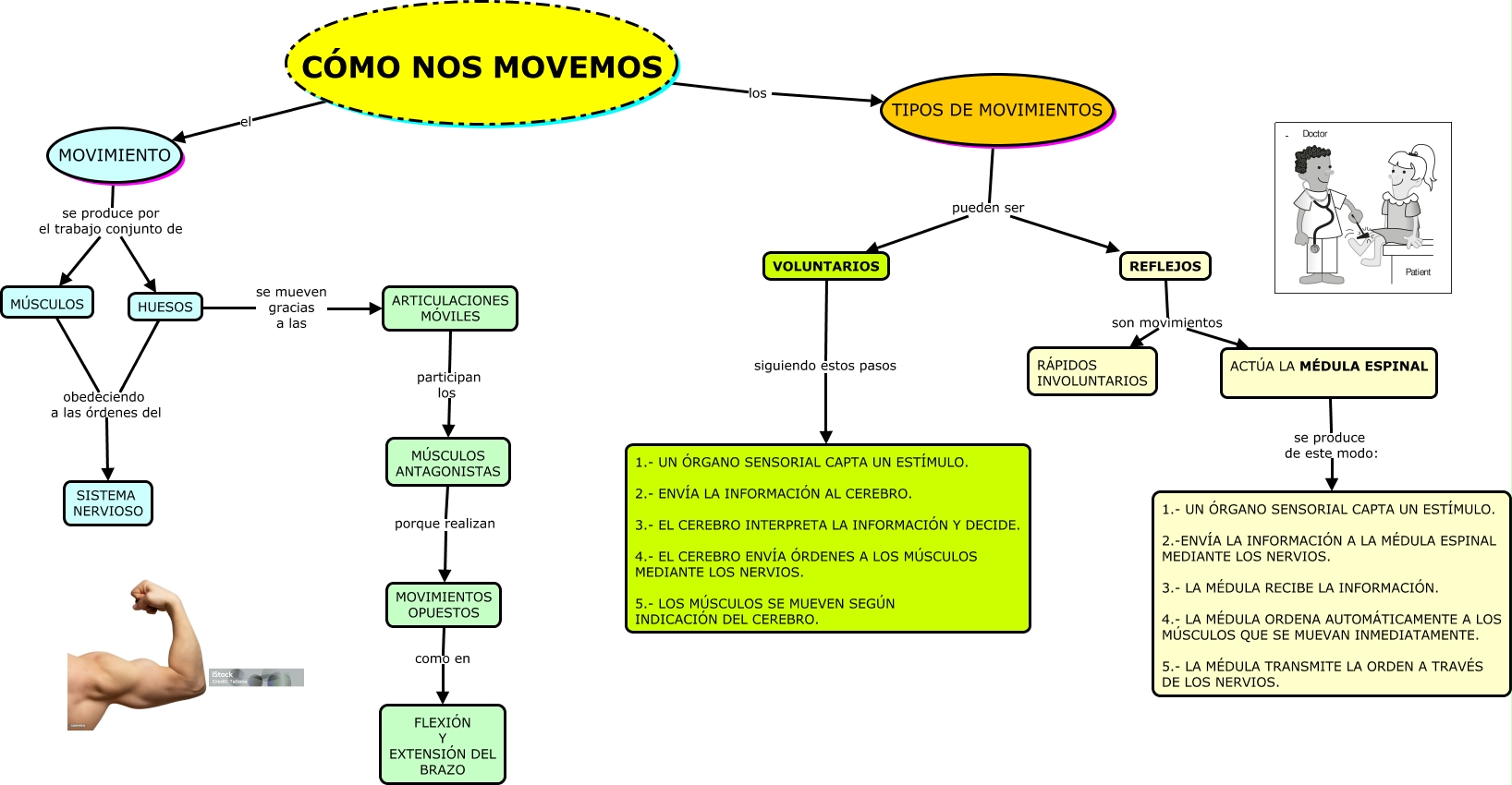 Este Cmap, tiene información relacionada con: CÓMO NOS MOVEMOS, MOVIMIENTOS OPUESTOS como en FLEXIÓN Y EXTENSIÓN DEL BRAZO, CÓMO NOS MOVEMOS el MOVIMIENTO, ARTICULACIONES MÓVILES participan los MÚSCULOS ANTAGONISTAS, REFLEJOS son movimientos RÁPIDOS INVOLUNTARIOS, HUESOS se mueven gracias a las ARTICULACIONES MÓVILES, VOLUNTARIOS siguiendo estos pasos 1.- UN ÓRGANO SENSORIAL CAPTA UN ESTÍMULO. 2.- ENVÍA LA INFORMACIÓN AL CEREBRO. 3.- EL CEREBRO INTERPRETA LA INFORMACIÓN Y DECIDE. 4.- EL CEREBRO ENVÍA ÓRDENES A LOS MÚSCULOS MEDIANTE LOS NERVIOS. 5.- LOS MÚSCULOS SE MUEVEN SEGÚN INDICACIÓN DEL CEREBRO., TIPOS DE MOVIMIENTOS pueden ser REFLEJOS, MÚSCULOS ANTAGONISTAS porque realizan MOVIMIENTOS OPUESTOS, HUESOS obedeciendo a las órdenes del SISTEMA NERVIOSO, TIPOS DE MOVIMIENTOS pueden ser VOLUNTARIOS, CÓMO NOS MOVEMOS los TIPOS DE MOVIMIENTOS, ACTÚA LA MÉDULA ESPINAL se produce de este modo: 1.- UN ÓRGANO SENSORIAL CAPTA UN ESTÍMULO. 2.-ENVÍA LA INFORMACIÓN A LA MÉDULA ESPINAL MEDIANTE LOS NERVIOS. 3.- LA MÉDULA RECIBE LA INFORMACIÓN. 4.- LA MÉDULA ORDENA AUTOMÁTICAMENTE A LOS MÚSCULOS QUE SE MUEVAN INMEDIATAMENTE. 5.- LA MÉDULA TRANSMITE LA ORDEN A TRAVÉS DE LOS NERVIOS., MÚSCULOS obedeciendo a las órdenes del SISTEMA NERVIOSO, MOVIMIENTO se produce por el trabajo conjunto de HUESOS, MOVIMIENTO se produce por el trabajo conjunto de MÚSCULOS, REFLEJOS son movimientos ACTÚA LA MÉDULA ESPINAL