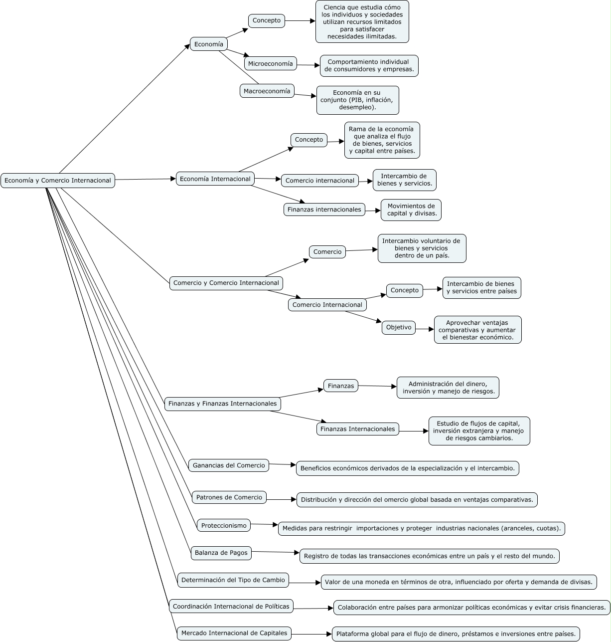 Este Cmap, tiene información relacionada con: Kennia Rueda, Economía y Comercio Internacional ???? Mercado Internacional de Capitales, Economía y Comercio Internacional ???? Finanzas y Finanzas Internacionales, Concepto ???? Ciencia que estudia cómo los individuos y sociedades utilizan recursos limitados para satisfacer necesidades ilimitadas., Determinación del Tipo de Cambio ???? Valor de una moneda en términos de otra, influenciado por oferta y demanda de divisas., Comercio Internacional ???? Objetivo, Finanzas y Finanzas Internacionales ???? Finanzas Internacionales, Coordinación Internacional de Políticas ???? Colaboración entre países para armonizar políticas económicas y evitar crisis financieras., Ganancias del Comercio ???? Beneficios económicos derivados de la especialización y el intercambio., Comercio y Comercio Internacional ???? Comercio, Finanzas y Finanzas Internacionales ???? Finanzas, Economía y Comercio Internacional ???? Ganancias del Comercio, Comercio y Comercio Internacional ???? Comercio Internacional, Economía ???? Microeconomía, Economía Internacional ???? Concepto, Concepto ???? Rama de la economía que analiza el flujo de bienes, servicios y capital entre países., Finanzas internacionales ???? Movimientos de capital y divisas., Concepto ???? Intercambio de bienes y servicios entre países, Economía y Comercio Internacional ???? Coordinación Internacional de Políticas, Proteccionismo ???? Medidas para restringir importaciones y proteger industrias nacionales (aranceles, cuotas)., Economía y Comercio Internacional ???? Determinación del Tipo de Cambio