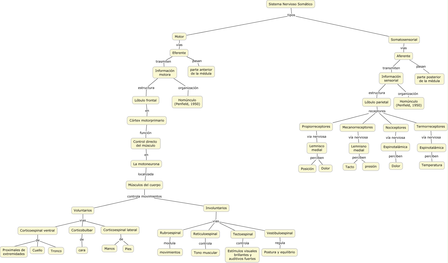 Este Cmap, tiene información relacionada con: Sistema Nervioso Somático, Corticoespinal lateral de Pies, Involuntarios vías Tectoespinal, Corticoespinal ventral de Tronco, Lemnisno medial perciben Tacto, Músculos del cuerpo controla movimientos Voluntarios, Somatosensorial vias Aferente, Lemnisno medial perciben presión, Eferente pasan parte anterior de la médula, Espinotalámica perciben Dolor, Sistema Nervioso Somático tipos Motor, Nociceptores vía nerviosa Espinotalámica, Aferente pasan parte posterior de la médula, Termorreceptores vía nerviosa Espinotalámica, Corticoespinal ventral de Cuello, Corticoespinal ventral de Proximales de extremidades, Córtex motorprimario función Control directo del músculo, Reticuloespinal controla Tono muscular, Lóbulo parietal receptores Termorreceptores, Lóbulo parietal receptores Propiorreceptores, Motor vías Eferente