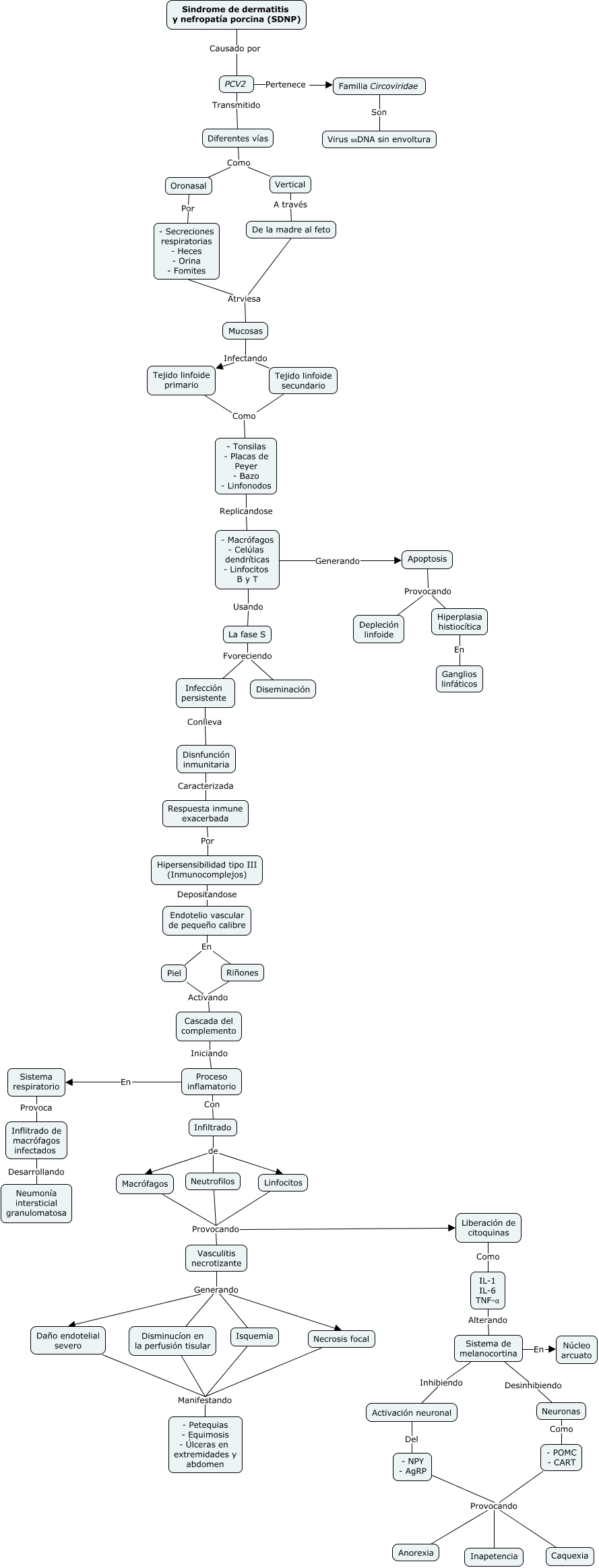 Este Cmap, tiene información relacionada con: Circovirus porcino, Linfocitos Provocando Liberación de citoquinas, Piel Activando Cascada del complemento, Diferentes vías Como Vertical, Mucosas Infectando Tejido linfoide primario, Vasculitis necrotizante Generando Daño endotelial severo, Endotelio vascular de pequeño calibre En Riñones, Hiperplasia histiocítica En Ganglios linfáticos, Apoptosis Provocando Depleción linfoide, Neutrofilos Provocando Vasculitis necrotizante, Riñones Activando Cascada del complemento, La fase S Fvoreciendo Infección persistente, Cascada del complemento Iniciando Proceso inflamatorio, Sistema de melanocortina En Núcleo arcuato, Vasculitis necrotizante Generando Disminucíon en la perfusión tisular, IL-1 IL-6 TNF-α Alterando Sistema de melanocortina, PCV2 Transmitido Diferentes vías, Mucosas Infectando Tejido linfoide secundario, Isquemia Manifestando - Petequias - Equimosis - Úlceras en extremidades y abdomen, Activación neuronal Del - NPY - AgRP, Necrosis focal Manifestando - Petequias - Equimosis - Úlceras en extremidades y abdomen