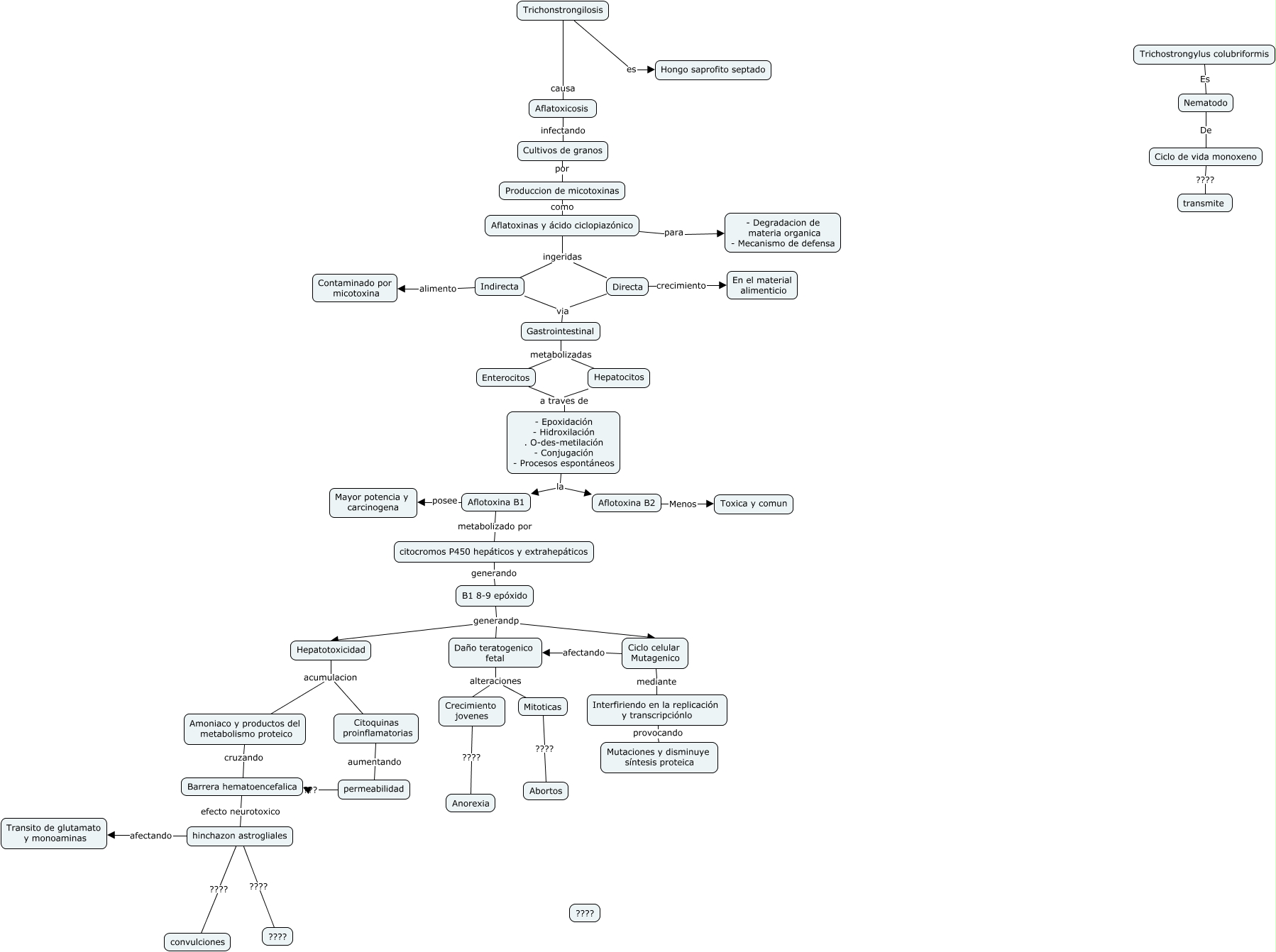 Este Cmap, tiene información relacionada con: Aflatoxicosis, hinchazon astrogliales afectando Transito de glutamato y monoaminas, Amoniaco y productos del metabolismo proteico cruzando Barrera hematoencefalica, Aflotoxina B1 posee Mayor potencia y carcinogena, hinchazon astrogliales ???? convulciones, Aflatoxinas y ácido ciclopiazónico para - Degradacion de materia organica - Mecanismo de defensa, Trichonstrongilosis es Hongo saprofito septado, Ciclo de vida monoxeno ???? transmite, Aflatoxinas y ácido ciclopiazónico ingeridas Directa, Crecimiento jovenes ???? Anorexia, Hepatotoxicidad acumulacion Amoniaco y productos del metabolismo proteico, Indirecta alimento Contaminado por micotoxina, Mitoticas ???? Abortos, Trichostrongylus colubriformis Es Nematodo, citocromos P450 hepáticos y extrahepáticos generando B1 8-9 epóxido, Barrera hematoencefalica efecto neurotoxico hinchazon astrogliales, Aflotoxina B1 metabolizado por citocromos P450 hepáticos y extrahepáticos, B1 8-9 epóxido generandp Ciclo celular Mutagenico, Daño teratogenico fetal alteraciones Crecimiento jovenes, permeabilidad ???? Barrera hematoencefalica, Aflatoxicosis infectando Cultivos de granos