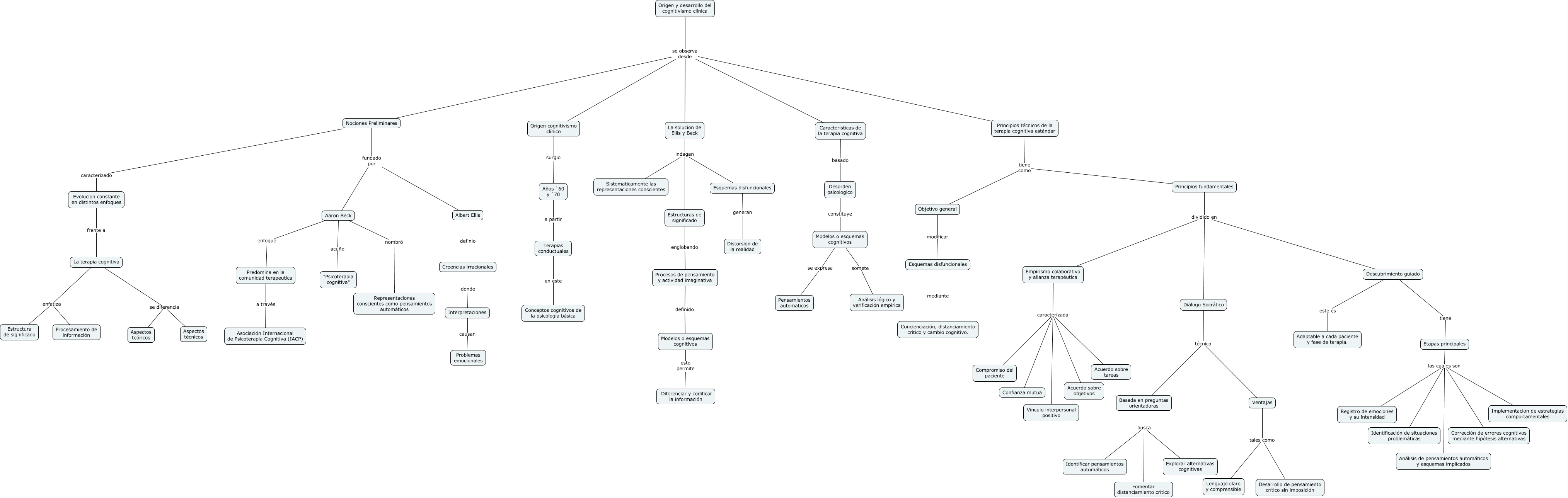 Este Cmap, tiene información relacionada con: Origen y desarrollo del cognitivismo clinica, Descubrimiento guiado tiene Etapas principales, Descubrimiento guiado este es Adaptable a cada paciente y fase de terapia., Principios técnicos de la terapia cognitiva estándar tiene como Objetivo general, Empirismo colaborativo y alianza terapéutica caracterizada Vínculo interpersonal positivo, Origen cognitivismo clínico surgio Años `60 y `70, Nociones Preliminares fundado por Albert Ellis, Modelos o esquemas cognitivos se expresa Pensamientos automaticos, Predomina en la comunidad terapeutica a través Asociación Internacional de Psicoterapia Cognitiva (IACP), Basada en preguntas orientadoras busca Identificar pensamientos automáticos, Origen y desarrollo del cognitivismo clínica se observa desde Nociones Preliminares, Aaron Beck enfoque Predomina en la comunidad terapeutica, Procesos de pensamiento y actividad imaginativa definido Modelos o esquemas cognitivos, La solucion de Ellis y Beck indagan Sistematicamente las representaciones conscientes, Evolucion constante en distintos enfoques frente a La terapia cognitiva, La terapia cognitiva se diferencia Aspectos teóricos, Albert Ellis definio Creencias irracionales, Empirismo colaborativo y alianza terapéutica caracterizada Acuerdo sobre objetivos, Principios fundamentales dividido en Descubrimiento guiado, Años `60 y `70 a partir Terapias conductuales, Empirismo colaborativo y alianza terapéutica caracterizada Compromiso del paciente