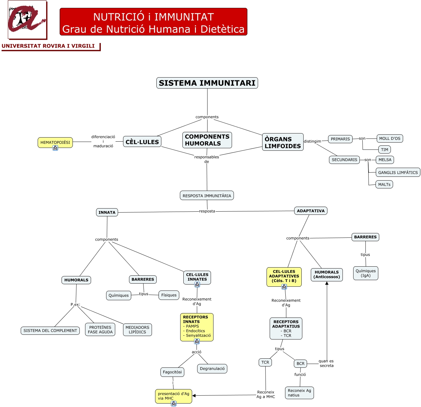 Este Cmap, tiene información relacionada con: index, RESPOSTA IMMUNITÀRIA resposta ADAPTATIVA, INNATA components HUMORALS, RECEPTORS INNATS - PAMPS - Endocítics - Senyalització acció Fagocitòsi, RECEPTORS ADAPTATIUS - BCR - TCR tipus BCR, CÈL·LULES diferenciació i maduració HEMATOPOIÈSI, HUMORALS P.ex: PROTEÏNES FASE AGUDA, TCR Reconeix Ag a MHC presentació d'Ag via MHC, SISTEMA IMMUNITARI components CÈL·LULES, COMPONENTS HUMORALS responsables de RESPOSTA IMMUNITÀRIA, ADAPTATIVA components BARRERES, CEL·LULES ADAPTATIVES (Cèls. T i B) Reconeixement d'Ag RECEPTORS ADAPTATIUS - BCR - TCR, CEL·LULES INNATES Reconeixement d'Ag RECEPTORS INNATS - PAMPS - Endocítics - Senyalització, BCR quan es secreta HUMORALS (Anticossos), CÈL·LULES responsables de RESPOSTA IMMUNITÀRIA, HUMORALS P.ex: SISTEMA DEL COMPLEMENT, BARRERES tipus Físiques, BARRERES tipus Químiques (IgA), HUMORALS P.ex: MEDIADORS LIPÍDICS, BCR funció Reconeix Ag natius, ADAPTATIVA components HUMORALS (Anticossos)