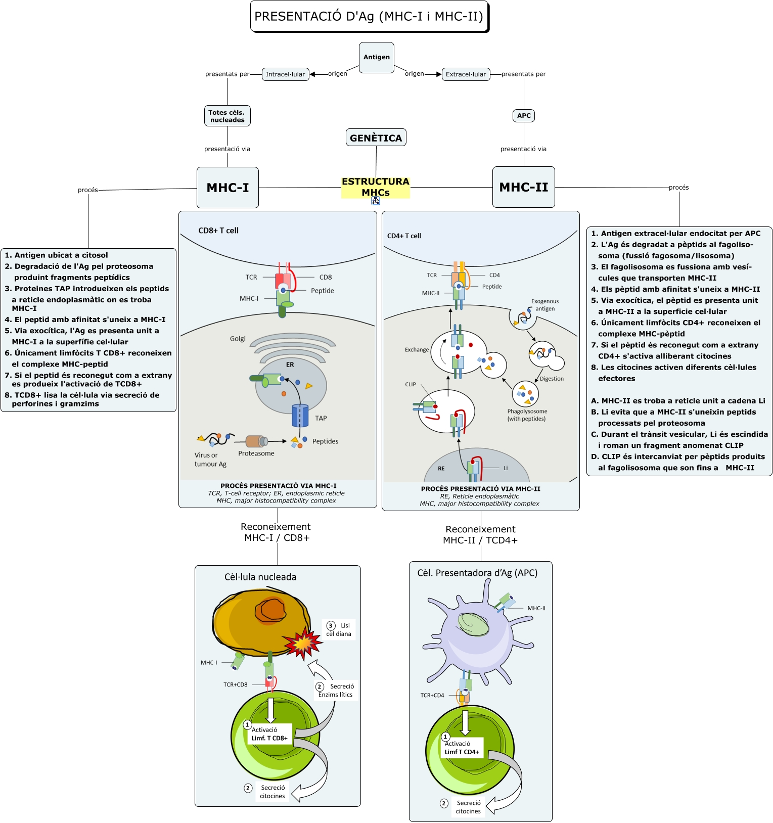 Este Cmap, tiene información relacionada con: MHCs, MHC-II procés 1. Antigen extracel·lular endocitat per APC 2. L'Ag és degradat a pèptids al fagoliso- soma (fussió fagosoma/lisosoma) 3. El fagolisosoma es fussiona amb vesí- cules que transporten MHC-II 4. Els pèptid amb afinitat s'uneix a MHC-II 5. Via exocítica, el pèptid es presenta unit a MHC-II a la superficie cel·lular 6. Únicament limfòcits CD4+ reconeixen el complexe MHC-pèptid 7. Si el pèptid és reconegut com a extrany CD4+ s'activa alliberant citocines 8. Les citocines activen diferents cèl·lules efectores A. MHC-II es troba a reticle unit a cadena Li B. Li evita que a MHC-II s'uneixin peptids processats pel proteosoma C. Durant el trànsit vesicular, Li és escindida i roman un fragment anomenat CLIP D. CLIP és intercanviat per pèptids produits al fagolisosoma que son fins a MHC-II, Extracel·lular presentats per APC, MHC-I procés 1. Antigen ubicat a citosol 2. Degradació de l'Ag pel proteosoma produint fragments peptídics 3. Proteines TAP introdueixen els peptids a reticle endoplasmàtic on es troba MHC-I 4. El peptid amb afinitat s'uneix a MHC-I 5. Via exocítica, l'Ag es presenta unit a MHC-I a la superfífie cel·lular 6. Únicament limfòcits T CD8+ reconeixen el complexe MHC-peptid 7. Si el peptid és reconegut com a extrany es produeix l'activació de TCD8+ 8. TCD8+ lisa la cèl·lula via secreció de perforines i gramzims, MHC-I ESTRUCTURA MHCs MHC-II, Antigen origen Intracel·lular, Intracel·lular presentats per Totes cèls. nucleades, Antigen origen Extracel·lular, MHC-I ESTRUCTURA MHCs GENÈTICA, APC presentació via MHC-II, Totes cèls. nucleades presentació via MHC-I, PROCÉS PRESENTACIÓ VIA MHC-II RE, Reticle endoplasmàtic MHC, major histocompatibility complex Reconeixement MHC-II / TCD4+, PROCÉS PRESENTACIÓ VIA MHC-I TCR, T-cell receptor; ER, endoplasmic reticle MHC, major histocompatibility complex Reconeixement MHC-I / CD8+