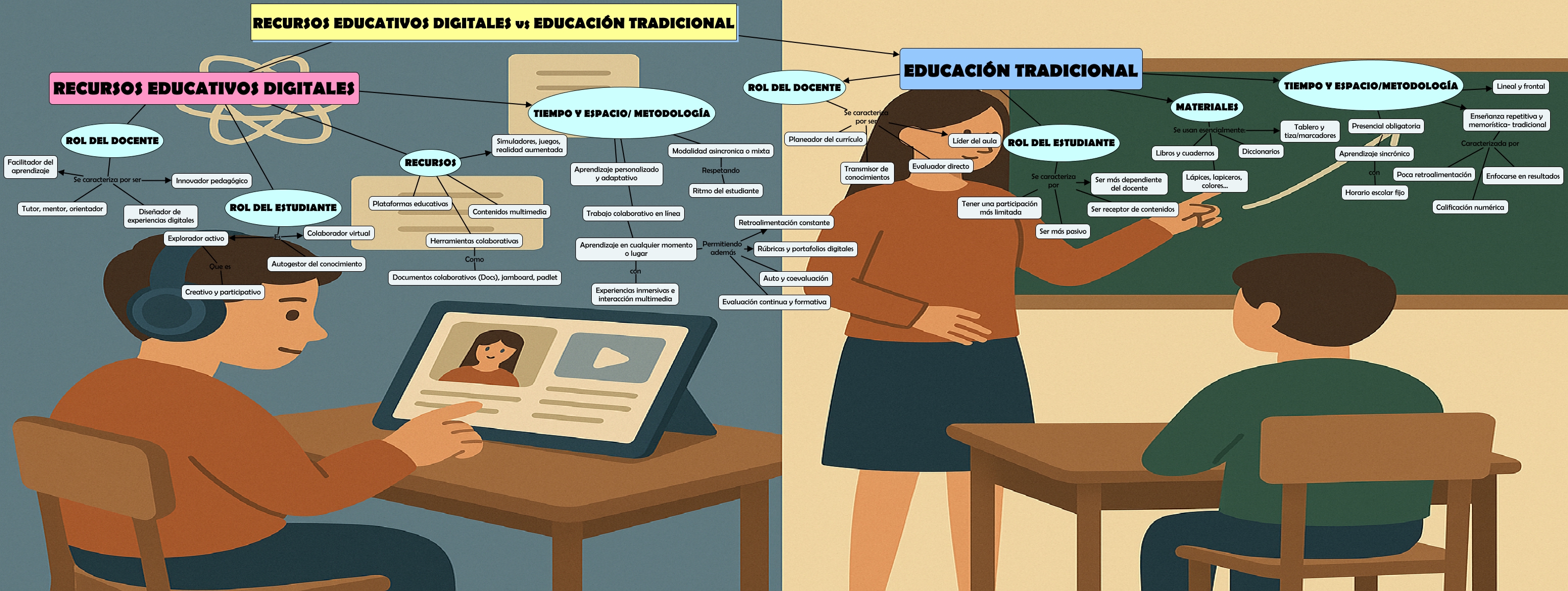 Este Cmap, tiene información relacionada con: EDUCACIÓN TRADICIONAL- RED, EDUCACIÓN TRADICIONAL ???? MATERIALES, ROL DEL DOCENTE Se caracteriza por ser Evaluador directo, TIEMPO Y ESPACIO/METODOLOGÍA ???? Enseñanza, Enseñanza repetitiva y memorística- tradicional Caracterizada por Calificación numérica, ROL DEL DOCENTE Se caracteriza por ser Facilitador del aprendizaje, ROL DEL DOCENTE Se caracteriza por ser Transmisor de conocimientos, ROL DEL ESTUDIANTE Se caracteriza por Ser más pasivo, Aprendizaje en cualquier momento o lugar con Experiencias inmersivas e interacción multimedia, RECURSOS EDUCATIVOS DIGITALES vs EDUCACIÓN TRADICIONAL ???? EDUCACIÓN TRADICIONAL, TIEMPO Y ESPACIO/ METODOLOGÍA ???? Trabajo colaborativo en línea, ROL DEL DOCENTE Se caracteriza por ser Diseñador de experiencias digitales, EDUCACIÓN TRADICIONAL ???? ROL DEL DOCENTE, RECURSOS EDUCATIVOS DIGITALES ???? TIEMPO Y ESPACIO/ METODOLOGÍA, Aprendizaje en cualquier momento o lugar Permitiendo además Evaluación continua y formativa, RECURSOS ???? Herramientas colaborativas, Explorador activo Que es Creativo y participativo, RECURSOS ???? Simuladores, juegos, realidad aumentada, MATERIALES Se usan esencialmente: Lápices, lapiceros, colores..., RECURSOS ???? Plataformas educativas, EDUCACIÓN TRADICIONAL ???? TIEMPO Y ESPACIO/METODOLOGÍA