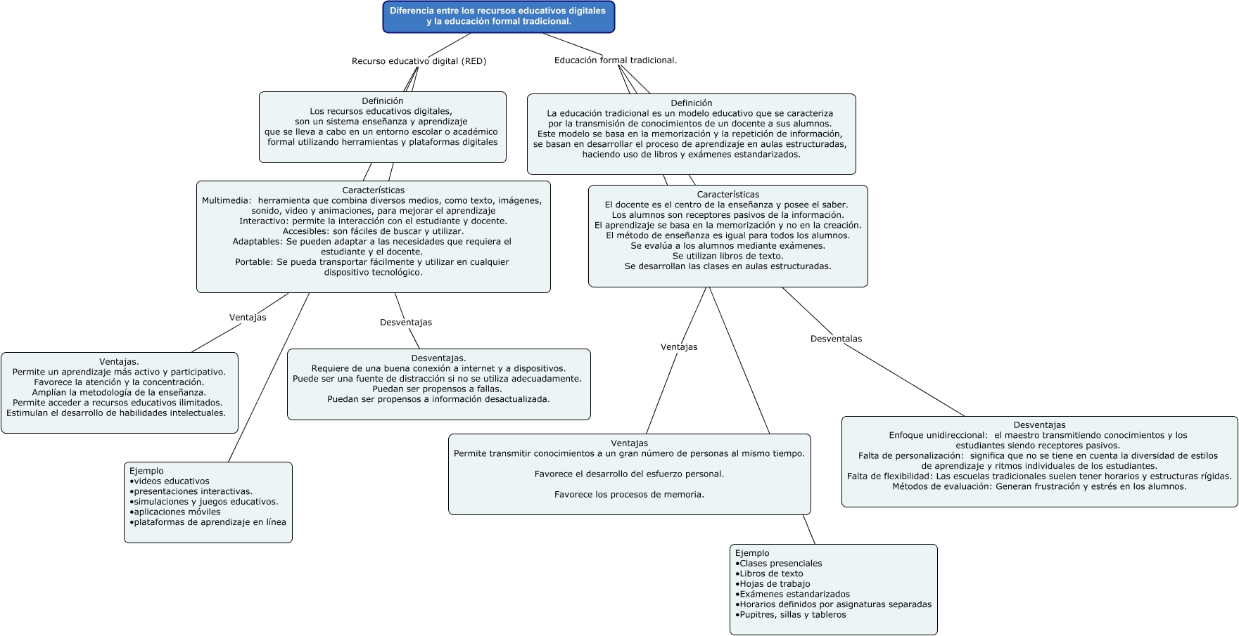 Este Cmap, tiene información relacionada con: DIFERENCIA ENTRE LOS RECURSOS EDUCATIVOS Y EDUCACION TRADICIONAL, Diferencia entre los recursos educativos digitales y la educación formal tradicional. Educación formal tradicional. Definición La educación tradicional es un modelo educativo que se caracteriza por la transmisión de conocimientos de un docente a sus alumnos. Este modelo se basa en la memorización y la repetición de información, se basan en desarrollar el proceso de aprendizaje en aulas estructuradas, haciendo uso de libros y exámenes estandarizados., Características Multimedia: herramienta que combina diversos medios, como texto, imágenes, sonido, video y animaciones, para mejorar el aprendizaje Interactivo: permite la interacción con el estudiante y docente. Accesibles: son fáciles de buscar y utilizar. Adaptables: Se pueden adaptar a las necesidades que requiera el estudiante y el docente. Portable: Se pueda transportar fácilmente y utilizar en cualquier dispositivo tecnológico. Ventajas Ventajas. Permite un aprendizaje más activo y participativo. Favorece la atención y la concentración. Amplían la metodología de la enseñanza. Permite acceder a recursos educativos ilimitados. Estimulan el desarrollo de habilidades intelectuales., Diferencia entre los recursos educativos digitales y la educación formal tradicional. Educación formal tradicional. Características El docente es el centro de la enseñanza y posee el saber. Los alumnos son receptores pasivos de la información. El aprendizaje se basa en la memorización y no en la creación. El método de enseñanza es igual para todos los alumnos. Se evalúa a los alumnos mediante exámenes. Se utilizan libros de texto. Se desarrollan las clases en aulas estructuradas., Diferencia entre los recursos educativos digitales y la educación formal tradicional. Recurso educativo digital (RED) Características Multimedia: herramienta que combina diversos medios, como texto, imágenes, sonido, video y animaciones, para mejorar el aprendizaje Interactivo: permite la interacción con el estudiante y docente. Accesibles: son fáciles de buscar y utilizar. Adaptables: Se pueden adaptar a las necesidades que requiera el estudiante y el docente. Portable: Se pueda transportar fácilmente y utilizar en cualquier dispositivo tecnológico., Diferencia entre los recursos educativos digitales y la educación formal tradicional. Educación formal tradicional. Ejemplo • Clases presenciales • Libros de texto • Hojas de trabajo • Exámenes estandarizados • Horarios definidos por asignaturas separadas • Pupitres, sillas y tableros, Características El docente es el centro de la enseñanza y posee el saber. Los alumnos son receptores pasivos de la información. El aprendizaje se basa en la memorización y no en la creación. El método de enseñanza es igual para todos los alumnos. Se evalúa a los alumnos mediante exámenes. Se utilizan libros de texto. Se desarrollan las clases en aulas estructuradas. Desventalas Desventajas Enfoque unidireccional: el maestro transmitiendo conocimientos y los estudiantes siendo receptores pasivos. Falta de personalización: significa que no se tiene en cuenta la diversidad de estilos de aprendizaje y ritmos individuales de los estudiantes. Falta de flexibilidad: Las escuelas tradicionales suelen tener horarios y estructuras rígidas. Métodos de evaluación: Generan frustración y estrés en los alumnos., Diferencia entre los recursos educativos digitales y la educación formal tradicional. Recurso educativo digital (RED) Ejemplo • videos educativos • presentaciones interactivas. • simulaciones y juegos educativos. • aplicaciones móviles • plataformas de aprendizaje en línea, Características Multimedia: herramienta que combina diversos medios, como texto, imágenes, sonido, video y animaciones, para mejorar el aprendizaje Interactivo: permite la interacción con el estudiante y docente. Accesibles: son fáciles de buscar y utilizar. Adaptables: Se pueden adaptar a las necesidades que requiera el estudiante y el docente. Portable: Se pueda transportar fácilmente y utilizar en cualquier dispositivo tecnológico. Desventajas Desventajas. Requiere de una buena conexión a internet y a dispositivos. Puede ser una fuente de distracción si no se utiliza adecuadamente. Puedan ser propensos a fallas. Puedan ser propensos a información desactualizada., Características El docente es el centro de la enseñanza y posee el saber. Los alumnos son receptores pasivos de la información. El aprendizaje se basa en la memorización y no en la creación. El método de enseñanza es igual para todos los alumnos. Se evalúa a los alumnos mediante exámenes. Se utilizan libros de texto. Se desarrollan las clases en aulas estructuradas. Ventajas Ventajas Permite transmitir conocimientos a un gran número de personas al mismo tiempo. Favorece el desarrollo del esfuerzo personal. Favorece los procesos de memoria., Diferencia entre los recursos educativos digitales y la educación formal tradicional. Recurso educativo digital (RED) Definición Los recursos educativos digitales, son un sistema enseñanza y aprendizaje que se lleva a cabo en un entorno escolar o académico formal utilizando herramientas y plataformas digitales