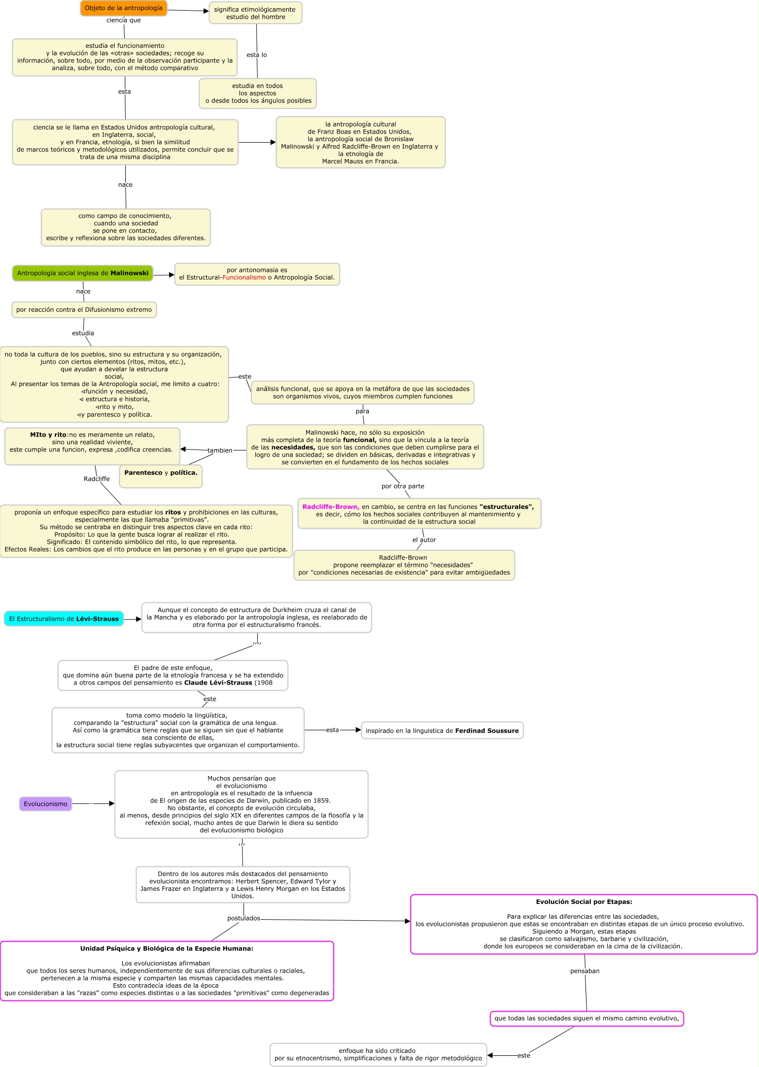 Este Cmap, tiene información relacionada con: ANTROPOLOGIA MINI RESUMEN UNID 1, Malinowski hace, no sólo su exposición más completa de la teoría funcional, sino que la vincula a la teoría de las necesidades, que son las condiciones que deben cumplirse para el logro de una sociedad; se dividen en básicas, derivadas e integrativas y se convierten en el fundamento de los hechos sociales tambien MIto y rito:no es meramente un relato, sino una realidad viviente, este cumple una funcion, expresa ,codifica creencias., Antropología social inglesa de Malinowski por por antonomasia es el Estructural-Funcionalismo o Antropología Social., significa etimológicamente estudio del hombre esta lo estudia en todos los aspectos o desde todos los ángulos posibles, El padre de este enfoque, que domina aún buena parte de la etnología francesa y se ha extendido a otros campos del pensamiento es Claude Lévi-Strauss (1908 este toma como modelo la lingüística, comparando la "estructura" social con la gramática de una lengua. Así como la gramática tiene reglas que se siguen sin que el hablante sea consciente de ellas, la estructura social tiene reglas subyacentes que organizan el comportamiento., Aunque el concepto de estructura de Durkheim cruza el canal de la Mancha y es elaborado por la antropología inglesa, es reelaborado de otra forma por el estructuralismo francés. ,,,, El padre de este enfoque, que domina aún buena parte de la etnología francesa y se ha extendido a otros campos del pensamiento es Claude Lévi-Strauss (1908, Dentro de los autores más destacados del pensamiento evolucionista encontramos: Herbert Spencer, Edward Tylor y James Frazer en Inglaterra y a Lewis Henry Morgan en los Estados Unidos. postulados Evolución Social por Etapas: Para explicar las diferencias entre las sociedades, los evolucionistas propusieron que estas se encontraban en distintas etapas de un único proceso evolutivo. Siguiendo a Morgan, estas etapas se clasificaron como salvajismo, barbarie y civilización, donde los europeos se consideraban en la cima de la civilización., ciencia se le llama en Estados Unidos antropología cultural, en Inglaterra, social, y en Francia, etnología, si bien la similitud de marcos teóricos y metodológicos utilizados, permite concluir que se trata de una misma disciplina nace como campo de conocimiento, cuando una sociedad se pone en contacto, escribe y reflexiona sobre las sociedades diferentes., toma como modelo la lingüística, comparando la "estructura" social con la gramática de una lengua. Así como la gramática tiene reglas que se siguen sin que el hablante sea consciente de ellas, la estructura social tiene reglas subyacentes que organizan el comportamiento. esta inspirado en la linguistica de Ferdinad Soussure, Malinowski hace, no sólo su exposición más completa de la teoría funcional, sino que la vincula a la teoría de las necesidades, que son las condiciones que deben cumplirse para el logro de una sociedad; se dividen en básicas, derivadas e integrativas y se convierten en el fundamento de los hechos sociales por otra parte Radcliffe-Brown, en cambio, se centra en las funciones "estructurales", es decir, cómo los hechos sociales contribuyen al mantenimiento y la continuidad de la estructura social, MIto y rito:no es meramente un relato, sino una realidad viviente, este cumple una funcion, expresa ,codifica creencias. Radcliffe proponía un enfoque específico para estudiar los ritos y prohibiciones en las culturas, especialmente las que llamaba "primitivas". Su método se centraba en distinguir tres aspectos clave en cada rito: Propósito: Lo que la gente busca lograr al realizar el rito. Significado: El contenido simbólico del rito, lo que representa. Efectos Reales: Los cambios que el rito produce en las personas y en el grupo que participa., Objeto de la antropología ???? significa etimológicamente estudio del hombre, Muchos pensarían que el evolucionismo en antropología es el resultado de la infuencia de El origen de las especies de Darwin, publicado en 1859. No obstante, el concepto de evolución circulaba, al menos, desde principios del siglo XIX en diferentes campos de la flosofía y la refexión social, mucho antes de que Darwin le diera su sentido del evolucionismo biológico ,,, Dentro de los autores más destacados del pensamiento evolucionista encontramos: Herbert Spencer, Edward Tylor y James Frazer en Inglaterra y a Lewis Henry Morgan en los Estados Unidos., Malinowski hace, no sólo su exposición más completa de la teoría funcional, sino que la vincula a la teoría de las necesidades, que son las condiciones que deben cumplirse para el logro de una sociedad; se dividen en básicas, derivadas e integrativas y se convierten en el fundamento de los hechos sociales tambien Parentesco y política., Radcliffe-Brown, en cambio, se centra en las funciones "estructurales", es decir, cómo los hechos sociales contribuyen al mantenimiento y la continuidad de la estructura social el autor Radcliffe-Brown propone reemplazar el término "necesidades" por "condiciones necesarias de existencia" para evitar ambigüedades, Antropología social inglesa de Malinowski nace por reacción contra el Difusionismo extremo, que todas las sociedades siguen el mismo camino evolutivo, este enfoque ha sido criticado por su etnocentrismo, simplificaciones y falta de rigor metodológico, no toda la cultura de los pueblos, sino su estructura y su organización, junto con ciertos elementos (ritos, mitos, etc.), que ayudan a develar la estructura social, Al presentar los temas de la Antropología social, me limito a cuatro: ⊲función y necesidad, ⊲ estructura e historia, ⊲rito y mito, ⊲y parentesco y política. este análisis funcional, que se apoya en la metáfora de que las sociedades son organismos vivos, cuyos miembros cumplen funciones, Evolución Social por Etapas: Para explicar las diferencias entre las sociedades, los evolucionistas propusi