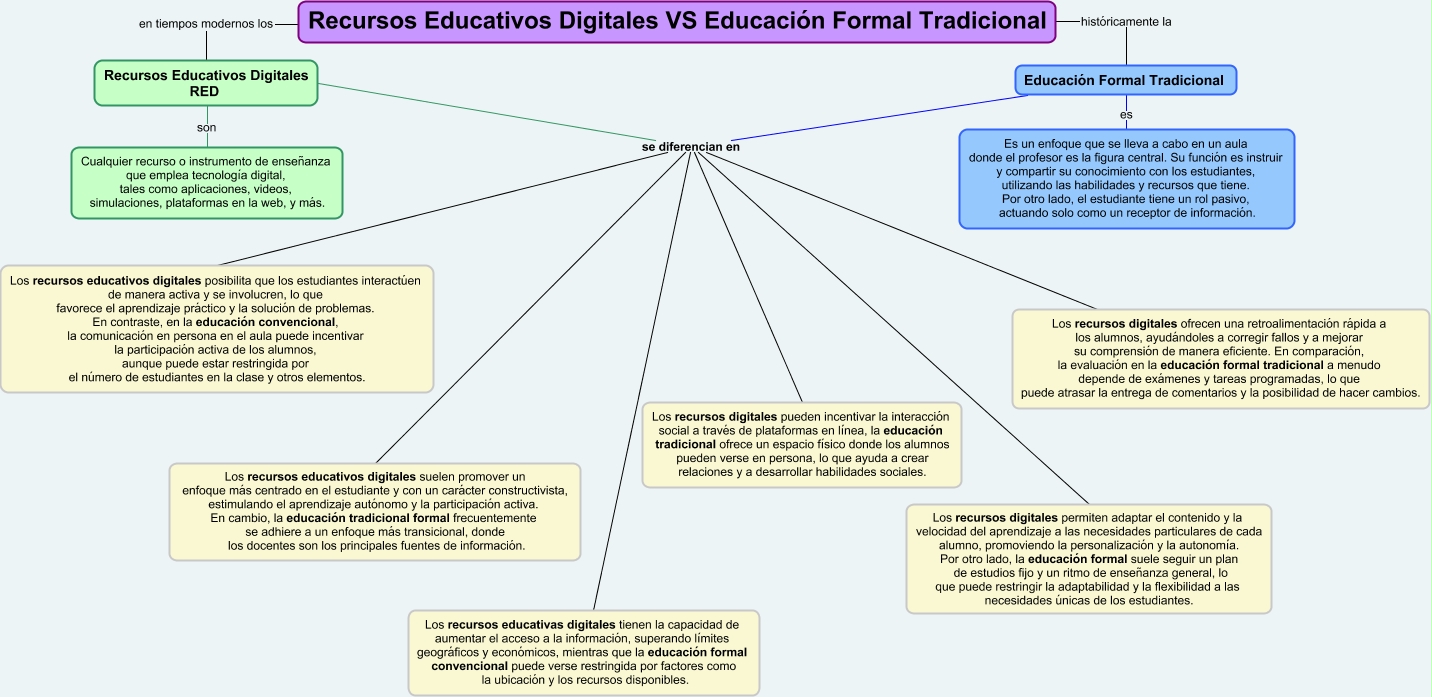 Este Cmap, tiene información relacionada con: Mapa conceptual “CmapTools” RED - E.Formal Tradicional, Recursos Educativos Digitales VS Educación Formal Tradicional en tiempos modernos los Recursos Educativos Digitales RED, Recursos Educativos Digitales RED son Cualquier recurso o instrumento de enseñanza que emplea tecnología digital, tales como aplicaciones, videos, simulaciones, plataformas en la web, y más., Educación Formal Tradicional se diferencian en Los recursos educativos digitales suelen promover un enfoque más centrado en el estudiante y con un carácter constructivista, estimulando el aprendizaje autónomo y la participación activa. En cambio, la educación tradicional formal frecuentemente se adhiere a un enfoque más transicional, donde los docentes son los principales fuentes de información., Educación Formal Tradicional se diferencian en Recursos Educativos Digitales RED, Recursos Educativos Digitales VS Educación Formal Tradicional históricamente la Educación Formal Tradicional, Educación Formal Tradicional se diferencian en Los recursos digitales pueden incentivar la interacción social a través de plataformas en línea, la educación tradicional ofrece un espacio físico donde los alumnos pueden verse en persona, lo que ayuda a crear relaciones y a desarrollar habilidades sociales., Educación Formal Tradicional se diferencian en Los recursos digitales permiten adaptar el contenido y la velocidad del aprendizaje a las necesidades particulares de cada alumno, promoviendo la personalización y la autonomía. Por otro lado, la educación formal suele seguir un plan de estudios fijo y un ritmo de enseñanza general, lo que puede restringir la adaptabilidad y la flexibilidad a las necesidades únicas de los estudiantes., Educación Formal Tradicional se diferencian en Los recursos digitales ofrecen una retroalimentación rápida a los alumnos, ayudándoles a corregir fallos y a mejorar su comprensión de manera eficiente. En comparación, la evaluación en la educación formal tradicional a menudo depende de exámenes y tareas programadas, lo que puede atrasar la entrega de comentarios y la posibilidad de hacer cambios., Educación Formal Tradicional se diferencian en Los recursos educativas digitales tienen la capacidad de aumentar el acceso a la información, superando límites geográficos y económicos, mientras que la educación formal convencional puede verse restringida por factores como la ubicación y los recursos disponibles., Educación Formal Tradicional se diferencian en Los recursos educativos digitales posibilita que los estudiantes interactúen de manera activa y se involucren, lo que favorece el aprendizaje práctico y la solución de problemas. En contraste, en la educación convencional, la comunicación en persona en el aula puede incentivar la participación activa de los alumnos, aunque puede estar restringida por el número de estudiantes en la clase y otros elementos., Educación Formal Tradicional es Es un enfoque que se lleva a cabo en un aula donde el profesor es la figura central. Su función es instruir y compartir su conocimiento con los estudiantes, utilizando las habilidades y recursos que tiene. Por otro lado, el estudiante tiene un rol pasivo, actuando solo como un receptor de información.