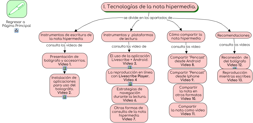 Este Cmap, tiene información relacionada con: I Tecnologia de la Nota Hipermedia, I. Tecnologías de la nota hipermedia. se divide en los apartados de Instrumentos de escritura de la nota hipermedia, I. Tecnologías de la nota hipermedia. se divide en los apartados de Cómo compartir la nota hipermedia, I. Tecnologías de la nota hipermedia. se divide en los apartados de Instrumentos y plataformas de lectura, Instrumentos de escritura de la nota hipermedia consulta los videos de Instalación de aplicaciones para uso del bolográfo. Video 2., I. Tecnologías de la nota hipermedia. se divide en los apartados de Recomendaciones, Instrumentos y plataformas de lectura consulta los video de El uso de la aplicación Livescribe + Android. Video 3., Instrumentos de escritura de la nota hipermedia consulta los videos de Presentación de boligrafo y accesorrios. Video 1., Recomendaciones consulta los videos Reconexión de del bolígrafo Video 12., Cómo compartir la nota hipermedia consulta los video Compartir "Pencast" desde Android Video 8.
