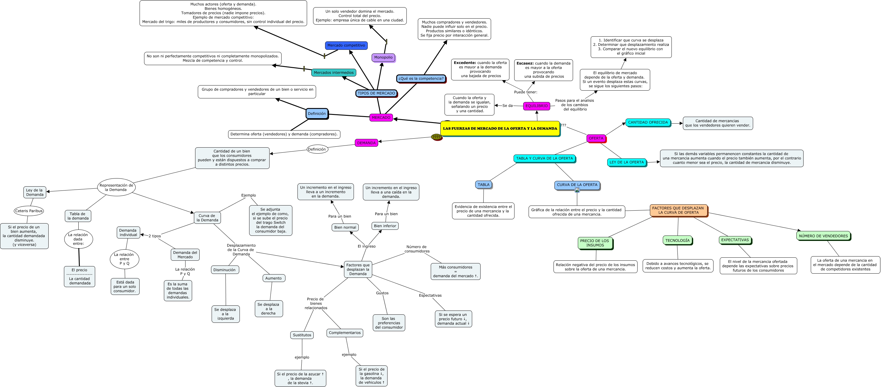 Este Cmap, tiene información relacionada con: Sin Título, MERCADO Definición Determina oferta (vendedores) y demanda (compradores)., Factores que desplazan la Demanda Número de consumidores Más consumidores = demanda del mercado ↑., MERCADO TIPOS DE MERCADO Mercados intermedios, Curva de la Demanda Ejemplo Se adjunta el ejemplo de como, si se sube el precio del trago Switch la demanda del consumidor baja., Gráfica de la relación entre el precio y la cantidad ofrecida de una mercancia. ???? FACTORES QUE DESPLAZAN LA CURVA DE OFERTA, Factores que desplazan la Demanda Gustos Son las preferencias del consumidor, OFERTA ???? TABLA Y CURVA DE LA OFERTA, Cantidad de un bien que los consumidores pueden y están dispuestos a comprar a distintos precios. Representación de la Demanda Tabla de la demanda, MERCADO TIPOS DE MERCADO Mercado competitivo, PRECIO DE LOS INSUMOS ???? Relación negativa del precio de los insumos sobre la oferta de una mercancia., TABLA ???? Evidencia de existencia entre el precio de una mercancia y la cantidad ofrecida., TABLA Y CURVA DE LA OFERTA ???? TABLA, EQUILIBRIO Puede tener: Excedente: cuando la oferta es mayor a la demanda provocando una bajada de precios, FACTORES QUE DESPLAZAN LA CURVA DE OFERTA ???? EXPECTATIVAS, EQUILIBRIO Pasos para el analisis de los cambios del equilibrio El equilibrio de mercado depende de la oferta y demanda. Si un evento desplaza estas curvas, se sigue los siguientes pasos:, Disminución ???? Se desplaza a la izquierda, Aumento ???? Se desplaza a la derecha, Factores que desplazan la Demanda El ingreso Bien normal, Demanda individual La relación entre P y Q Está dada para un solo consumidor., CURVA DE LA OFERTA ???? Gráfica de la relación entre el precio y la cantidad ofrecida de una mercancia.