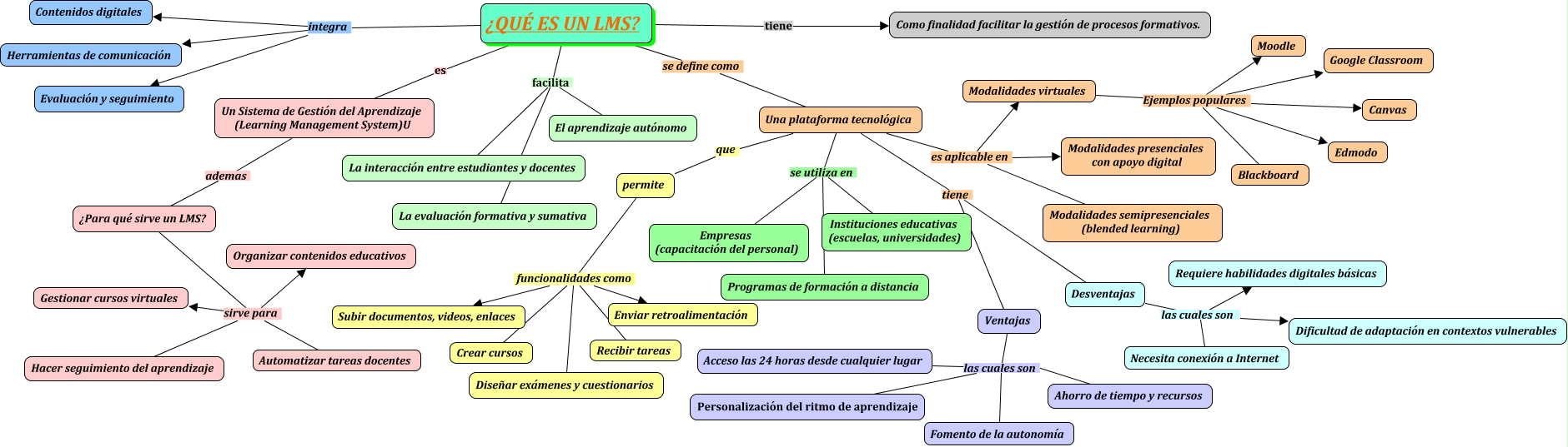 Este Cmap, tiene información relacionada con: INES PERALTA1, ¿QUÉ ES UN LMS? facilita La interacción entre estudiantes y docentes, Desventajas las cuales son Dificultad de adaptación en contextos vulnerables, Ventajas las cuales son Fomento de la autonomía, Una plataforma tecnológica es aplicable en Modalidades presenciales con apoyo digital, Una plataforma tecnológica se utiliza en Programas de formación a distancia, Desventajas las cuales son Requiere habilidades digitales básicas, Desventajas las cuales son Necesita conexión a Internet, Una plataforma tecnológica se utiliza en Instituciones educativas (escuelas, universidades), ¿QUÉ ES UN LMS? integra Contenidos digitales, ¿QUÉ ES UN LMS? integra Herramientas de comunicación, Acceso las 24 horas desde cualquier lugar las cuales son Fomento de la autonomía, Una plataforma tecnológica se utiliza en Empresas (capacitación del personal), ¿QUÉ ES UN LMS? facilita La evaluación formativa y sumativa, Personalización del ritmo de aprendizaje las cuales son Fomento de la autonomía, Una plataforma tecnológica tiene Desventajas, Una plataforma tecnológica que permite, Una plataforma tecnológica es aplicable en Modalidades semipresenciales (blended learning), Modalidades virtuales Ejemplos populares Canvas, permite funcionalidades como Enviar retroalimentación, Modalidades virtuales Ejemplos populares Blackboard