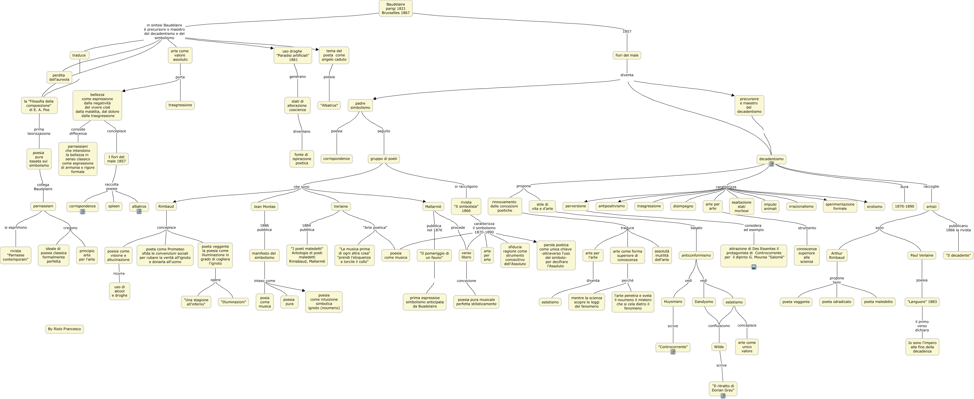 Questa Cmap, creata con IHMC CmapTools, contiene informazioni relative a: Decadentismo, arte come forma superiore di conoscenza perchè mentre la scienza scopre le leggi del fenomeno, decadentismo dura 1870-1890, decadentismo propone rinnovamento delle concezioni poetiche, Jean Morèas 1886 pubblica manifesto del simbolismo, I fiori del male 1857 raccolta poesie spleen, Baudelaire parigi 1821 Bruxselles 1867 in sintesi Baudelaire è precursore e maestro del decadentismo e del simbolismo la "Filosofia della composizione" di E. A. Poe, Baudelaire parigi 1821 Bruxselles 1867 in sintesi Baudelaire è precursore e maestro del decadentismo e del simbolismo traduce, gruppo di poeti si raccolgono rivista "Il simbolista" 1866, poesia come visione e allucinazione ricorre uso di alcool e droghe, "Languore" 1883 il primo verso dichiara Io sono l'impero alla fine della decadenza, Arthur Rimbaud propone temi poeta sdradicato, Dandysmo confluiscono Wilde, padre simbolismo poesia corrispondenze, estetismo confluiscono Wilde, Baudelaire parigi 1821 Bruxselles 1867 in sintesi Baudelaire è precursore e maestro del decadentismo e del simbolismo tema del poeta come angelo caduto, poeta veggente la poesia come illuminazione in grado di cogliera l'ignoto opere "Una stagione all'inferno", rivista "Il simbolista" 1866 caratterizza il simbolismo 1870-1890 parola poetica come unica chiave -attraverso l'uso del simbolo- per decifrare l'Assoluto, fiori del male diventa precursore e maestro del decadentismo, decadentismo raccoglie artisti, rivista "Il simbolista" 1866 caratterizza il simbolismo 1870-1890 sfiducia ragione come strumento conoscitivo dell'Assoluto