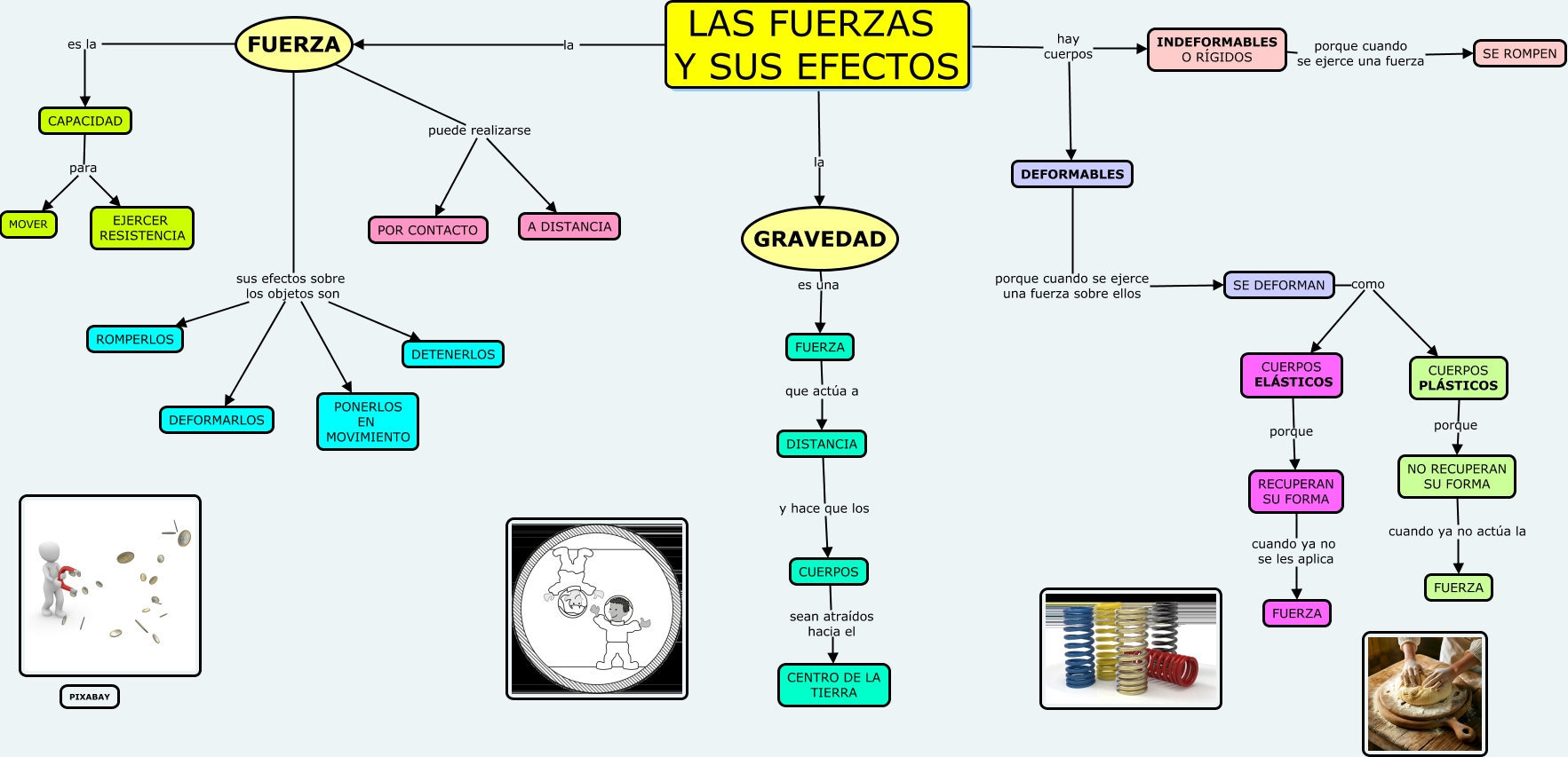 Este Cmap, tiene información relacionada con: LAS FUERZAS Y SUS EFECTOS, LAS FUERZAS Y SUS EFECTOS hay cuerpos INDEFORMABLES O RÍGIDOS, FUERZA puede realizarse A DISTANCIA, FUERZA que actúa a DISTANCIA, SE DEFORMAN como CUERPOS PLÁSTICOS, CUERPOS ELÁSTICOS porque RECUPERAN SU FORMA, GRAVEDAD es una FUERZA, RECUPERAN SU FORMA cuando ya no se les aplica FUERZA, FUERZA puede realizarse POR CONTACTO, FUERZA es la CAPACIDAD, INDEFORMABLES O RÍGIDOS porque cuando se ejerce una fuerza SE ROMPEN, SE DEFORMAN como CUERPOS ELÁSTICOS, FUERZA sus efectos sobre los objetos son PONERLOS EN MOVIMIENTO, CAPACIDAD para MOVER, CUERPOS PLÁSTICOS porque NO RECUPERAN SU FORMA, DEFORMABLES porque cuando se ejerce una fuerza sobre ellos SE DEFORMAN, FUERZA sus efectos sobre los objetos son DETENERLOS, CAPACIDAD para EJERCER RESISTENCIA, LAS FUERZAS Y SUS EFECTOS la GRAVEDAD, FUERZA sus efectos sobre los objetos son DEFORMARLOS, DISTANCIA y hace que los CUERPOS