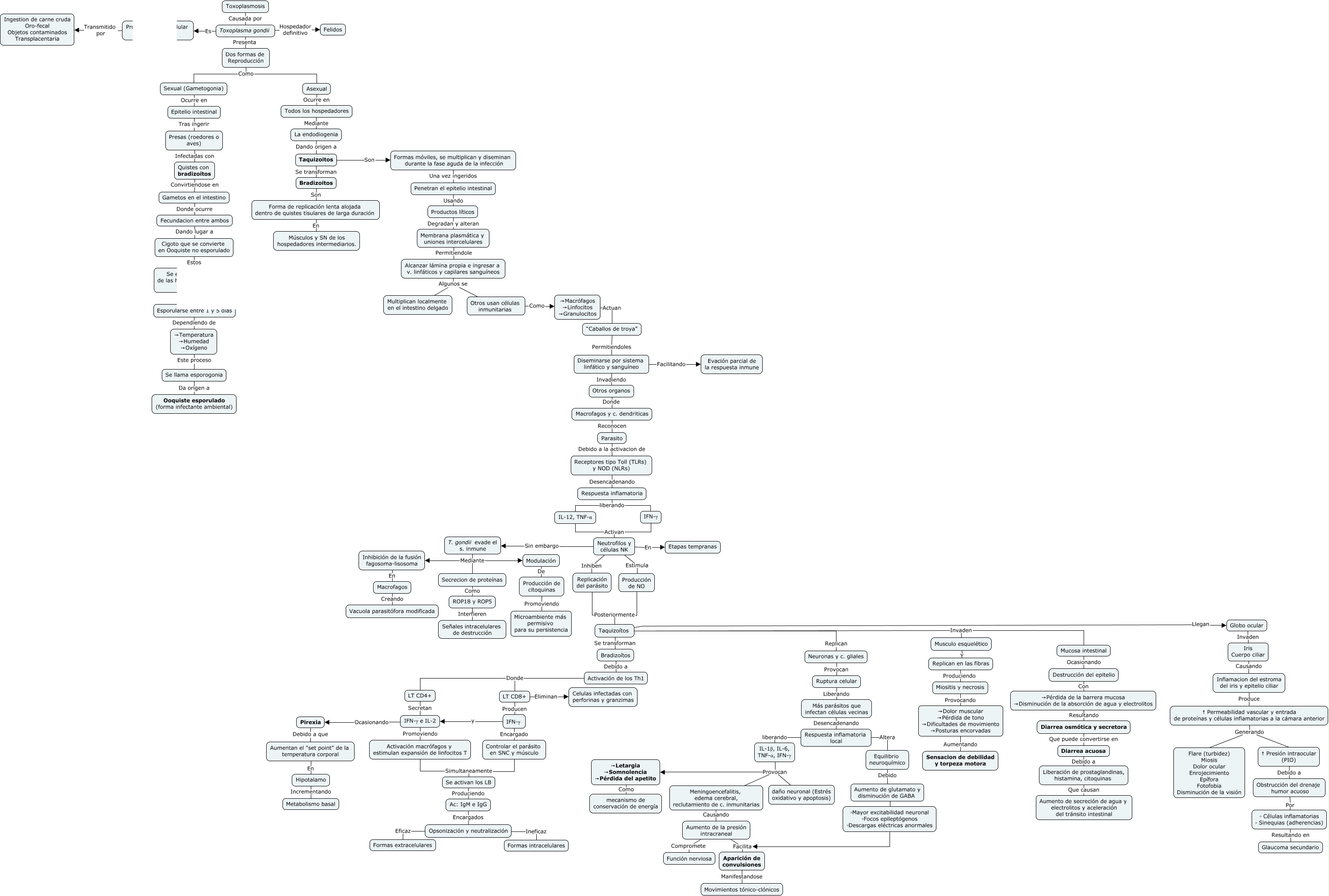Este Cmap, tiene información relacionada con: Medicina 3, Mucosa intestinal Ocasionando Destrucción del epitelio, →Pérdida de la barrera mucosa →Disminución de la absorción de agua y electrolitos Resultando Diarrea osmótica y secretora, IL-12, TNF-α Activan Neutrofilos y células NK, Alcanzar lámina propia e ingresar a v. linfáticos y capilares sanguíneos Algunos se Otros usan células inmunitarias, La endodiogenia Dando origen a Taquizoitos, Inhibición de la fusión fagosoma-lisosoma En Macrofagos, Diarrea acuosa Debido a Liberación de prostaglandinas, histamina, citoquinas, ↑ Presión intraocular (PIO) Debido a Obstrucción del drenaje humor acuoso, →Letargia →Somnolencia →Pérdida del apetito Como mecanismo de conservación de energía, Producción de NO Posteriormente Taquizoítos, Globo ocular Invaden Iris Cuerpo ciliar, Taquizoitos Se transforman Bradizoitos, T. gondii evade el s. inmune Mediante Modulación, Epitelio intestinal Tras ingerir Presas (roedores o aves), Aumento de glutamato y disminución de GABA LLevando ◦Mayor excitabilidad neuronal ◦Focos epileptógenos ◦Descargas eléctricas anormales, Meningoencefalitis, edema cerebral, reclutamiento de c. inmunitarias Causando Aumento de la presión intracraneal, Dos formas de Reproducción Como Asexual, Todos los hospedadores Mediante La endodiogenia, Miositis y necrosis Provocando →Dolor muscular →Pérdida de tono →Dificultades de movimiento →Posturas encorvadas, Asexual Ocurre en Todos los hospedadores