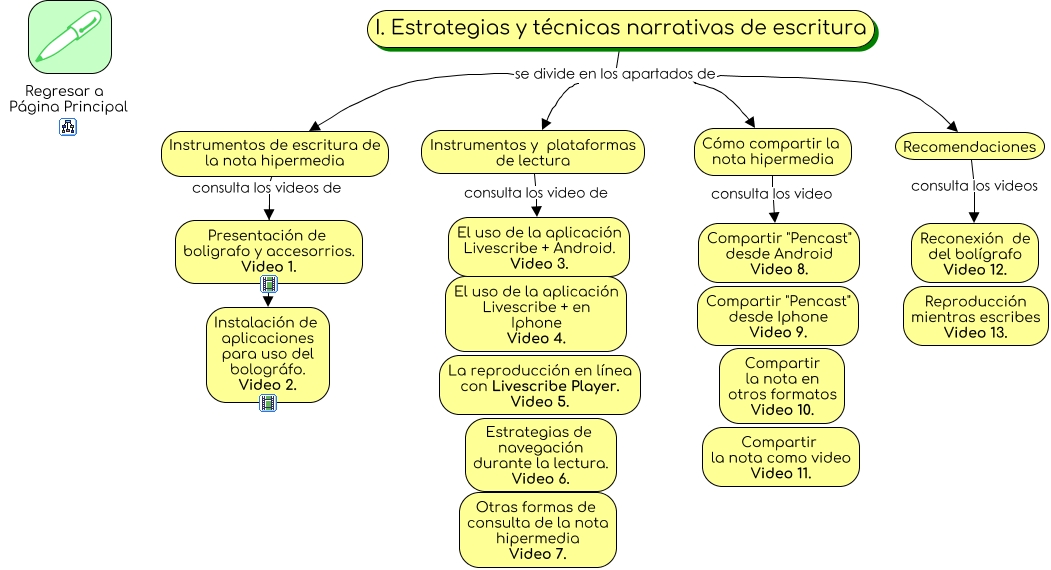 Este Cmap, tiene información relacionada con: II Estrategias y Tecnicas Narrativas, I. Estrategias y técnicas narrativas de escritura se divide en los apartados de Instrumentos de escritura de la nota hipermedia, I. Estrategias y técnicas narrativas de escritura se divide en los apartados de Cómo compartir la nota hipermedia, I. Estrategias y técnicas narrativas de escritura se divide en los apartados de Instrumentos y plataformas de lectura, Instrumentos de escritura de la nota hipermedia consulta los videos de Instalación de aplicaciones para uso del bolográfo. Video 2., I. Estrategias y técnicas narrativas de escritura se divide en los apartados de Recomendaciones, Instrumentos y plataformas de lectura consulta los video de El uso de la aplicación Livescribe + Android. Video 3., Instrumentos de escritura de la nota hipermedia consulta los videos de Presentación de boligrafo y accesorrios. Video 1., Recomendaciones consulta los videos Reconexión de del bolígrafo Video 12., Cómo compartir la nota hipermedia consulta los video Compartir "Pencast" desde Android Video 8.
