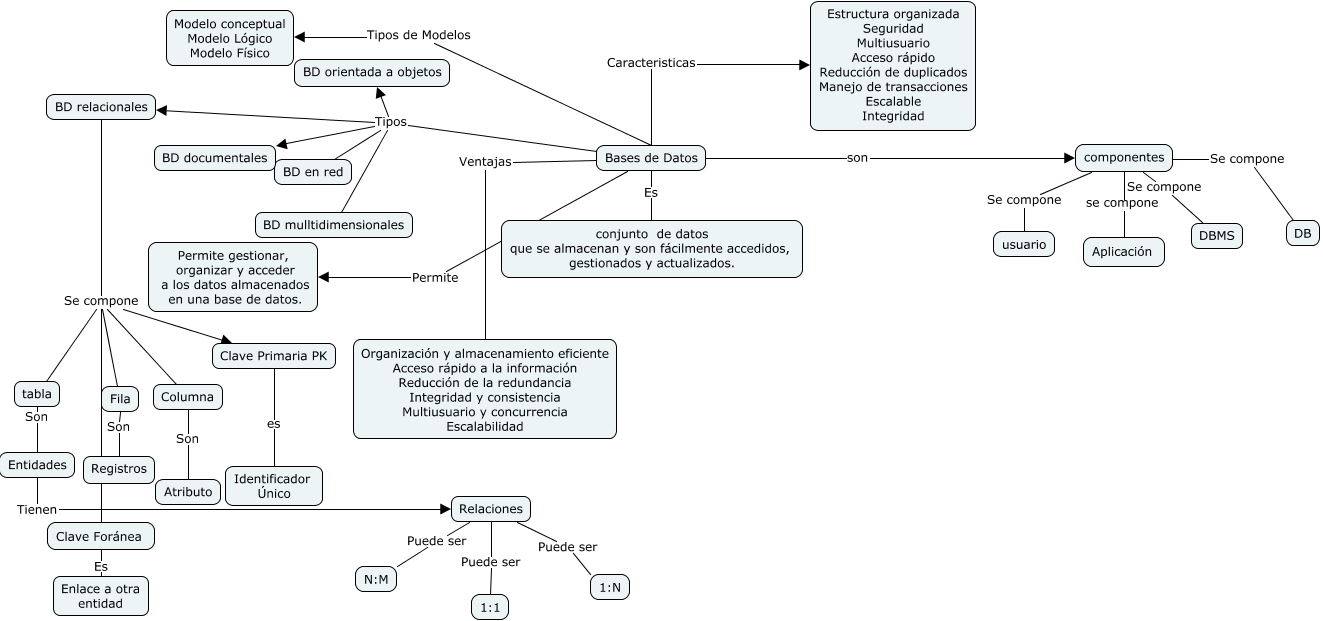Este Cmap, tiene información relacionada con: BD, BD relacionales Se compone Fila, Bases de Datos Tipos de Modelos Modelo conceptual Modelo Lógico Modelo Físico, Fila Son Registros, Bases de Datos Ventajas Organización y almacenamiento eficiente Acceso rápido a la información Reducción de la redundancia Integridad y consistencia Multiusuario y concurrencia Escalabilidad, Bases de Datos Tipos BD orientada a objetos, BD relacionales Se compone Clave Primaria PK, Bases de Datos Tipos BD documentales, Bases de Datos Tipos BD en red, Bases de Datos Permite Permite gestionar, organizar y acceder a los datos almacenados en una base de datos., BD relacionales Se compone Columna, Entidades Tienen Relaciones, componentes Se compone DB, Bases de Datos son componentes, Relaciones Puede ser 1:1, Bases de Datos Caracteristicas Estructura organizada Seguridad Multiusuario Acceso rápido Reducción de duplicados Manejo de transacciones Escalable Integridad, tabla Son Entidades, componentes se compone Aplicación, Clave Foránea Es Enlace a otra entidad, Bases de Datos Tipos BD mulltidimensionales, componentes Se compone DBMS