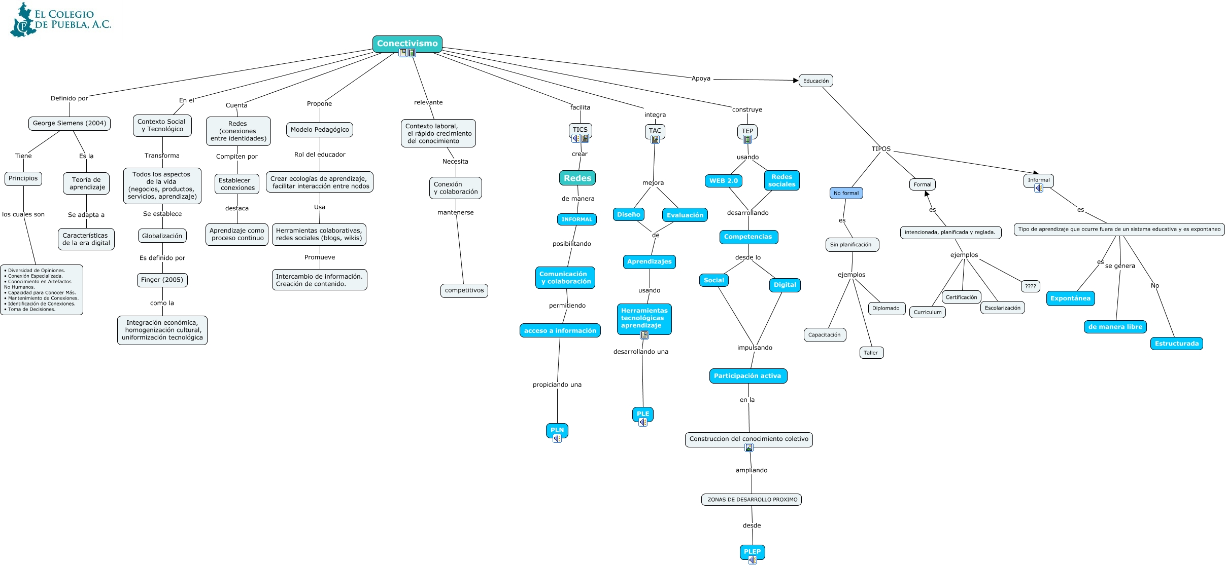 Este Cmap, tiene información relacionada con: Conectivismo, TAC mejora Evaluación, Globalización Es definido por Finger (2005), Herramientas tecnológicas aprendizaje desarrollando una PLE, TEP usando Redes sociales, Educación TIPOS Informal, intencionada, planificada y reglada. ejemplos Curriculum, INFORMAL posibilitando Comunicación y colaboración, Conectivismo Propone Modelo Pedagógico, Contexto laboral, el rápido crecimiento del conocimiento Necesita Conexión y colaboración, Herramientas colaborativas, redes sociales (blogs, wikis) Promueve Intercambio de información. Creación de contenido., Construccion del conocimiento coletivo ampliando ZONAS DE DESARROLLO PROXIMO, Conectivismo construye TEP, Sin planificación ejemplos Taller, Tipo de aprendizaje que ocurre fuera de un sistema educativa y es expontaneo No Estructurada, Certificación ejemplos Curriculum, ZONAS DE DESARROLLO PROXIMO desde PLEP, Conectivismo Cuenta Redes (conexiones entre identidades), Tipo de aprendizaje que ocurre fuera de un sistema educativa y es expontaneo se genera de manera libre, Establecer conexiones destaca Aprendizaje como proceso continuo, Redes sociales desarrollando Competencias