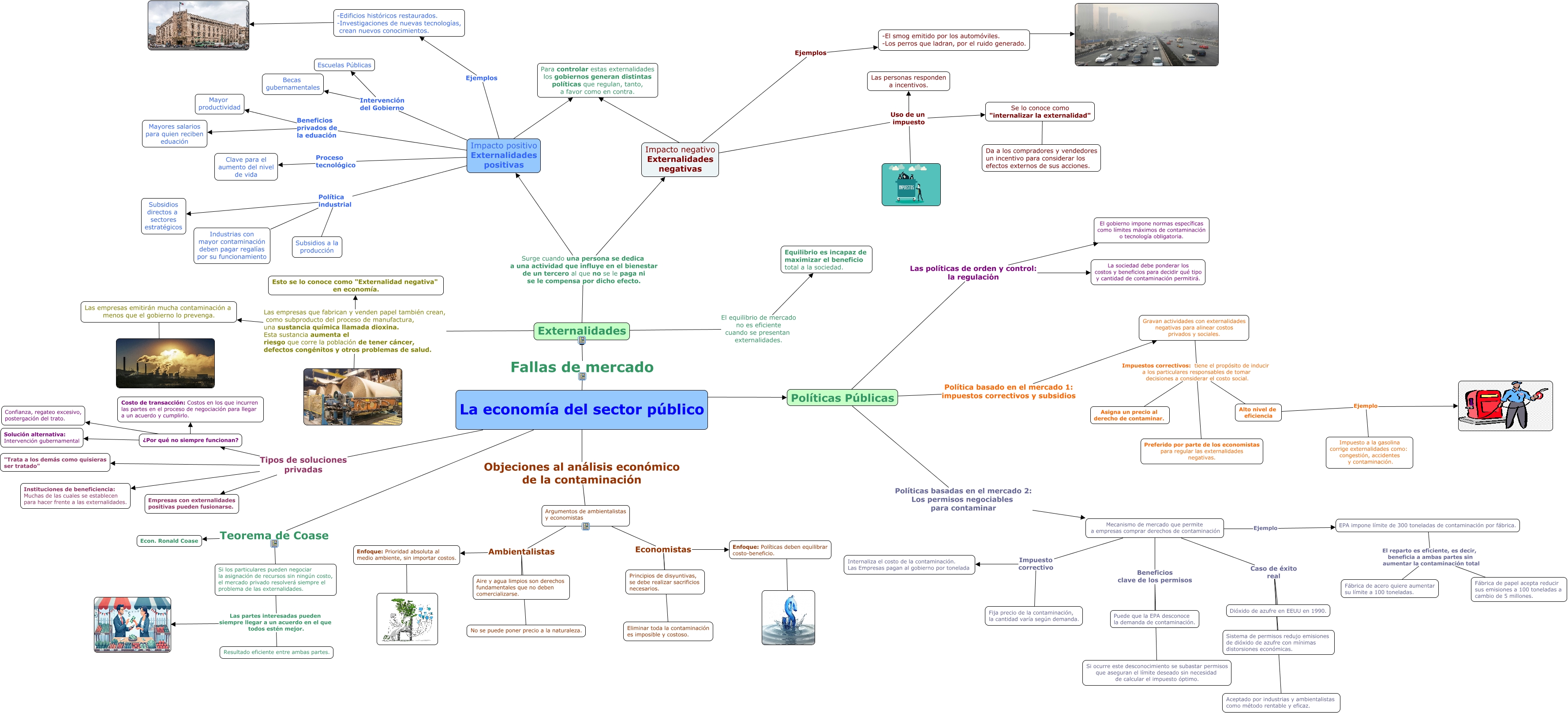 Este Cmap, tiene información relacionada con: La economía del sector público, ¿Por qué no siempre funcionan? ???? Costo de transacción: Costos en los que incurren las partes en el proceso de negociación para llegar a un acuerdo y cumplirlo., Impacto positivo Externalidades positivas Beneficios privados de la eduación Mayor productividad, Impacto negativo Externalidades negativas Ejemplos -El smog emitido por los automóviles. -Los perros que ladran, por el ruido generado., Externalidades El equilibrio de mercado no es eficiente cuando se presentan externalidades. Equilibrio es incapaz de maximizar el beneficio total a la sociedad., Argumentos de ambientalistas y economistas Economistas Enfoque: Políticas deben equilibrar costo-beneficio., Enfoque: Políticas deben equilibrar costo-beneficio. ????, Mecanismo de mercado que permite a empresas comprar derechos de contaminación Beneficios clave de los permisos Si ocurre este desconocimiento se subastar permisos que aseguran el límite deseado sin necesidad de calcular el impuesto óptimo., Políticas Públicas Las políticas de orden y control: la regulación El gobierno impone normas específicas como límites máximos de contaminación o tecnología obligatoria., EPA impone límite de 300 toneladas de contaminación por fábrica. El reparto es eficiente, es decir, beneficia a ambas partes sin aumentar la contaminación total Fábrica de acero quiere aumentar su límite a 100 toneladas., Argumentos de ambientalistas y economistas Ambientalistas Aire y agua limpios son derechos fundamentales que no deben comercializarse., Impacto positivo Externalidades positivas Ejemplos -Edificios históricos restaurados. -Investigaciones de nuevas tecnologías, crean nuevos conocimientos., Gravan actividades con externalidades negativas para alinear costos privados y sociales. Impuestos correctivos: tiene el propósito de inducir a los particulares responsables de tomar decisiones a considerar el costo social. Preferido por parte de los economistas para regular las externalidades negativas., La economía del sector público Tipos de soluciones privadas "Trata a los demás como quisieras ser tratado", Mecanismo de mercado que permite a empresas comprar derechos de contaminación Caso de éxito real Aceptado por industrias y ambientalistas como método rentable y eficaz., Externalidades Las empresas que fabrican y venden papel también crean, como subproducto del proceso de manufactura, una sustancia química llamada dioxina. Esta sustancia aumenta el riesgo que corre la población de tener cáncer, defectos congénitos y otros problemas de salud. Las empresas emitirán mucha contaminación a menos que el gobierno lo prevenga., Si los particulares pueden negociar la asignación de recursos sin ningún costo, el mercado privado resolverá siempre el problema de las externalidades. Las partes interesadas pueden siempre llegar a un acuerdo en el que todos estén mejor. Resultado eficiente entre ambas partes., La economía del sector público Tipos de soluciones privadas ¿Por qué no siempre funcionan?, Gravan actividades con externalidades negativas para alinear costos privados y sociales. Impuestos correctivos: tiene el propósito de inducir a los particulares responsables de tomar decisiones a considerar el costo social. Asigna un precio al derecho de contaminar., Las empresas emitirán mucha contaminación a menos que el gobierno lo prevenga. ????, Mecanismo de mercado que permite a empresas comprar derechos de contaminación Ejemplo EPA impone límite de 300 toneladas de contaminación por fábrica.