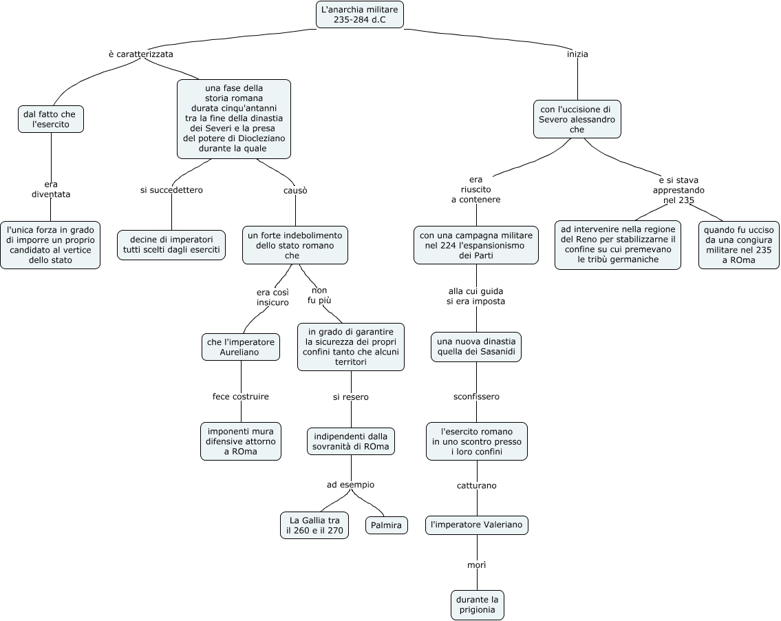 Questa Cmap, creata con IHMC CmapTools, contiene informazioni relative a: L'anarchia militare 235-284 d.C, una fase della storia romana durata cinqu'antanni tra la fine della dinastia dei Severi e la presa del potere di Diocleziano durante la quale si succedettero decine di imperatori tutti scelti dagli eserciti, L'anarchia militare 235-284 d.C è caratterizzata dal fatto che l'esercito, L'anarchia militare 235-284 d.C inizia con l'uccisione di Severo alessandro che, un forte indebolimento dello stato romano che era così insicuro che l'imperatore Aureliano, una fase della storia romana durata cinqu'antanni tra la fine della dinastia dei Severi e la presa del potere di Diocleziano durante la quale causò un forte indebolimento dello stato romano che, che l'imperatore Aureliano fece costruire imponenti mura difensive attorno a ROma, con l'uccisione di Severo alessandro che e si stava apprestando nel 235 ad intervenire nella regione del Reno per stabilizzarne il confine su cui premevano le tribù germaniche, indipendenti dalla sovranità di ROma ad esempio Palmira, una nuova dinastia quella dei Sasanidi sconfissero l'esercito romano in uno scontro presso i loro confini, indipendenti dalla sovranità di ROma ad esempio La Gallia tra il 260 e il 270, L'anarchia militare 235-284 d.C è caratterizzata una fase della storia romana durata cinqu'antanni tra la fine della dinastia dei Severi e la presa del potere di Diocleziano durante la quale, con l'uccisione di Severo alessandro che e si stava apprestando nel 235 quando fu ucciso da una congiura militare nel 235 a ROma, l'esercito romano in uno scontro presso i loro confini catturano l'imperatore Valeriano, con l'uccisione di Severo alessandro che era riuscito a contenere con una campagna militare nel 224 l'espansionismo dei Parti, un forte indebolimento dello stato romano che non fu più in grado di garantire la sicurezza dei propri confini tanto che alcuni territori, l'imperatore Valeriano morì durante la prigionia, in grado di garantire la sicurezza dei propri confini tanto che alcuni territori si resero indipendenti dalla sovranità di ROma, con una campagna militare nel 224 l'espansionismo dei Parti alla cui guida si era imposta una nuova dinastia quella dei Sasanidi, dal fatto che l'esercito era diventata l'unica forza in grado di imporre un proprio candidato al vertice dello stato