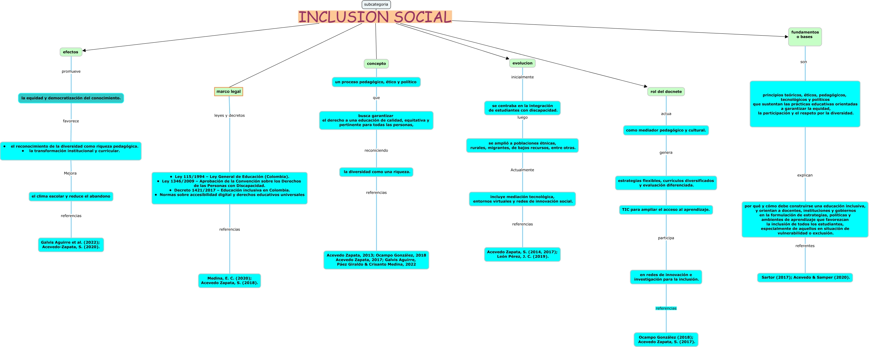 Este Cmap, tiene información relacionada con: subcategoria inclusion social. este, Acevedo Zapata, S. (2014, 2017); León Pérez, J. C. (2019). referencias incluye mediación tecnológica, entornos virtuales y redes de innovación social., se centraba en la integración de estudiantes con discapacidad. inicialmente evolucion, Ocampo González (2018); Acevedo Zapata, S. (2017). referencias en redes de innovación e investigación para la inclusión., • el reconocimiento de la diversidad como riqueza pedagógica. • la transformación institucional y curricular. favorece la equidad y democratización del conocimiento., el clima escolar y reduce el abandono Mejora • el reconocimiento de la diversidad como riqueza pedagógica. • la transformación institucional y curricular., Acevedo Zapata, 2013; Ocampo González, 2018 Acevedo Zapata, 2017; Galvis Aguirre, Páez Giraldo & Crisanto Medina, 2022 referencias la diversidad como una riqueza., la equidad y democratización del conocimiento. promueve efectos, busca garantizar el derecho a una educación de calidad, equitativa y pertinente para todas las personas, que un proceso pedagógico, ético y político, en redes de innovación e investigación para la inclusión. participa TIC para ampliar el acceso al aprendizaje., Medina, E. C. (2020); Acevedo Zapata, S. (2018). referencias • Ley 115/1994 – Ley General de Educación (Colombia). • Ley 1346/2009 – Aprobación de la Convención sobre los Derechos de las Personas con Discapacidad. • Decreto 1421/2017 – Educación inclusiva en Colombia. • Normas sobre accesibilidad digital y derechos educativos universales, incluye mediación tecnológica, entornos virtuales y redes de innovación social. Actualmente se amplió a poblaciones étnicas, rurales, migrantes, de bajos recursos, entre otras., Galvis Aguirre et al. (2022); Acevedo-Zapata, S. (2020). referencias el clima escolar y reduce el abandono, subcategoria INCLUSION SOCIAL efectos, subcategoria INCLUSION SOCIAL marco legal, subcategoria INCLUSION SOCIAL fundamentos o bases, como mediador pedagógico y cultural. actua rol del docnete, Sartor (2017); Acevedo & Samper (2020). referentes por qué y cómo debe construirse una educación inclusiva, y orientan a docentes, instituciones y gobiernos en la formulación de estrategias, políticas y ambientes de aprendizaje que favorezcan la inclusión de todos los estudiantes, especialmente de aquellos en situación de vulnerabilidad o exclusión., subcategoria INCLUSION SOCIAL evolucion, estrategias flexibles, currículos diversificados y evaluación diferenciada. genera como mediador pedagógico y cultural., • Ley 115/1994 – Ley General de Educación (Colombia). • Ley 1346/2009 – Aprobación de la Convención sobre los Derechos de las Personas con Discapacidad. • Decreto 1421/2017 – Educación inclusiva en Colombia. • Normas sobre accesibilidad digital y derechos educativos universales leyes y decretos marco legal