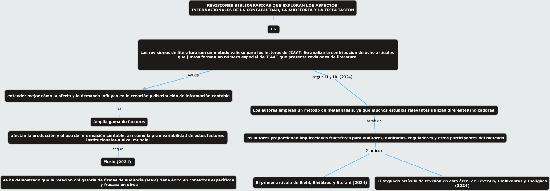 Este Cmap, tiene información relacionada con: TAREA REVISIONES BIBLIOGRAFICAS, los autores proporcionan implicaciones fructíferas para auditores, auditados, reguladores y otros participantes del mercado 2 articulos El segundo artículo de revisión en esta área, de Leventis, Tsalavoutas y Tsoligkas (2024), entender mejor cómo la oferta y la demanda influyen en la creación y distribución de información contable se Amplia gama de factores, Las revisiones de literatura son un método valioso para los lectores de JIAAT. Se analiza la contribución de ocho artículos que juntos forman un número especial de JIAAT que presenta revisiones de literatura. segun Li y Liu (2024) Los autores emplean un método de metaanálisis, ya que muchos estudios relevantes utilizan diferentes indicadores, REVISIONES BIBLIOGRAFICAS QUE EXPLORAN LOS ASPECTOS INTERNACIONALES DE LA CONTABILIDAD, LA AUDITORIA Y LA TRIBUTACION ES, Las revisiones de literatura son un método valioso para los lectores de JIAAT. Se analiza la contribución de ocho artículos que juntos forman un número especial de JIAAT que presenta revisiones de literatura. Ayuda entender mejor cómo la oferta y la demanda influyen en la creación y distribución de información contable, Los autores emplean un método de metaanálisis, ya que muchos estudios relevantes utilizan diferentes indicadores tambien los autores proporcionan implicaciones fructíferas para auditores, auditados, reguladores y otros participantes del mercado, los autores proporcionan implicaciones fructíferas para auditores, auditados, reguladores y otros participantes del mercado 2 articulos El primer artículo de Biehl, Bleibtreu y Stefani (2024), afectan la producción y el uso de información contable, así como la gran variabilidad de estos factores institucionales a nivel mundial segun Florio (2024)