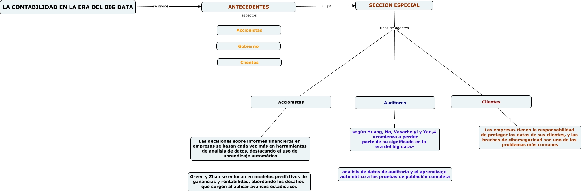 Este Cmap, tiene información relacionada con: 1111ADOLFO, Clientes Las empresas tienen la responsabilidad de proteger los datos de sus clientes, y las brechas de ciberseguridad son uno de los problemas más comunes, SECCION ESPECIAL tipos de agentes Accionistas, Accionistas Las decisiones sobre informes financieros en empresas se basan cada vez más en herramientas de análisis de datos, destacando el uso de aprendizaje automático, Clientes tipos de agentes Accionistas, ANTECEDENTES aspectos Accionistas, ANTECEDENTES incluye SECCION ESPECIAL, Auditores según Huang, No, Vasarhelyi y Yan,4 «comienza a perder parte de su significado en la era del big data», LA CONTABILIDAD EN LA ERA DEL BIG DATA se divide ANTECEDENTES, Auditores tipos de agentes Accionistas