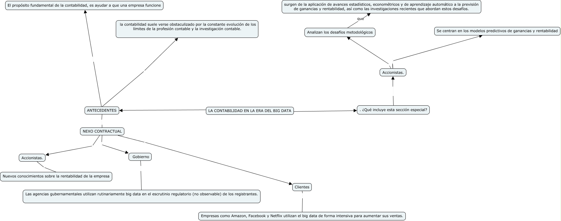 Este Cmap, tiene información relacionada con: 1ARTICA, LA CONTABILIDAD EN LA ERA DEL BIG DATA . ¿Qué incluye esta sección especial?, NEXO CONTRACTUAL Clientes, ANTECEDENTES El propósito fundamental de la contabilidad, es ayudar a que una empresa funcione, NEXO CONTRACTUAL Gobierno, Accionistas. Nuevos conocimientos sobre la rentabilidad de la empresa, Accionistas. Analizan los desafíos metodológicos, ANTECEDENTES la contabilidad suele verse obstaculizado por la constante evolución de los límites de la profesión contable y la investigación contable., LA CONTABILIDAD EN LA ERA DEL BIG DATA ANTECEDENTES, Accionistas. Se centran en los modelos predictivos de ganancias y rentabilidad, ANTECEDENTES NEXO CONTRACTUAL, NEXO CONTRACTUAL Accionistas., Clientes Empresas como Amazon, Facebook y Netflix utilizan el big data de forma intensiva para aumentar sus ventas., . ¿Qué incluye esta sección especial? Accionistas., Gobierno Las agencias gubernamentales utilizan rutinariamente big data en el escrutinio regulatorio (no observable) de los registrantes., Analizan los desafíos metodológicos que surgen de la aplicación de avances estadísticos, econométricos y de aprendizaje automático a la previsión de ganancias y rentabilidad, así como las investigaciones recientes que abordan estos desafíos.