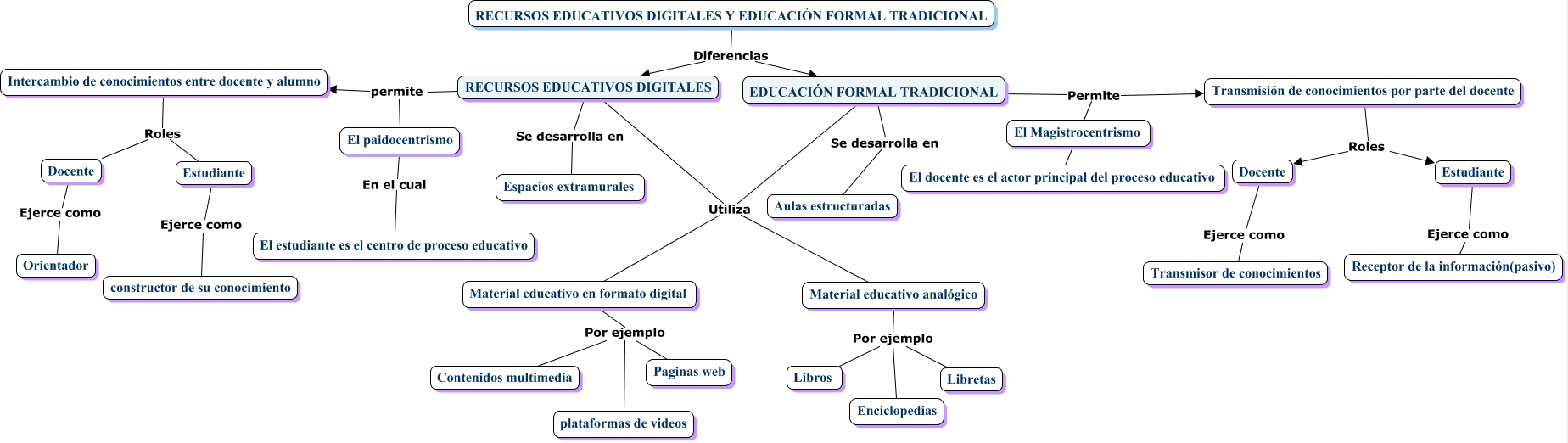 Este Cmap, tiene información relacionada con: Diferencias red y eft, EDUCACIÓN FORMAL TRADICIONAL Permite El Magistrocentrismo, El Magistrocentrismo En el cual El docente es el actor principal del proceso educativo, Estudiante Ejerce como constructor de su conocimiento, Material educativo analógico Por ejemplo Enciclopedias, EDUCACIÓN FORMAL TRADICIONAL Se desarrolla en Aulas estructuradas, Material educativo en formato digital Por ejemplo plataformas de videos, RECURSOS EDUCATIVOS DIGITALES Se desarrolla en Espacios extramurales, Material educativo analógico Por ejemplo Libretas, RECURSOS EDUCATIVOS DIGITALES Utiliza Material educativo analógico, Material educativo en formato digital Por ejemplo Paginas web, Material educativo analógico Por ejemplo Libros, El paidocentrismo En el cual El estudiante es el centro de proceso educativo, RECURSOS EDUCATIVOS DIGITALES permite El paidocentrismo, Transmisión de conocimientos por parte del docente Roles Estudiante, Docente Ejerce como Orientador, RECURSOS EDUCATIVOS DIGITALES Utiliza Material educativo en formato digital, Material educativo en formato digital Por ejemplo Contenidos multimedia, EDUCACIÓN FORMAL TRADICIONAL Permite Transmisión de conocimientos por parte del docente, EDUCACIÓN FORMAL TRADICIONAL Utiliza Material educativo en formato digital, Intercambio de conocimientos entre docente y alumno Roles Docente