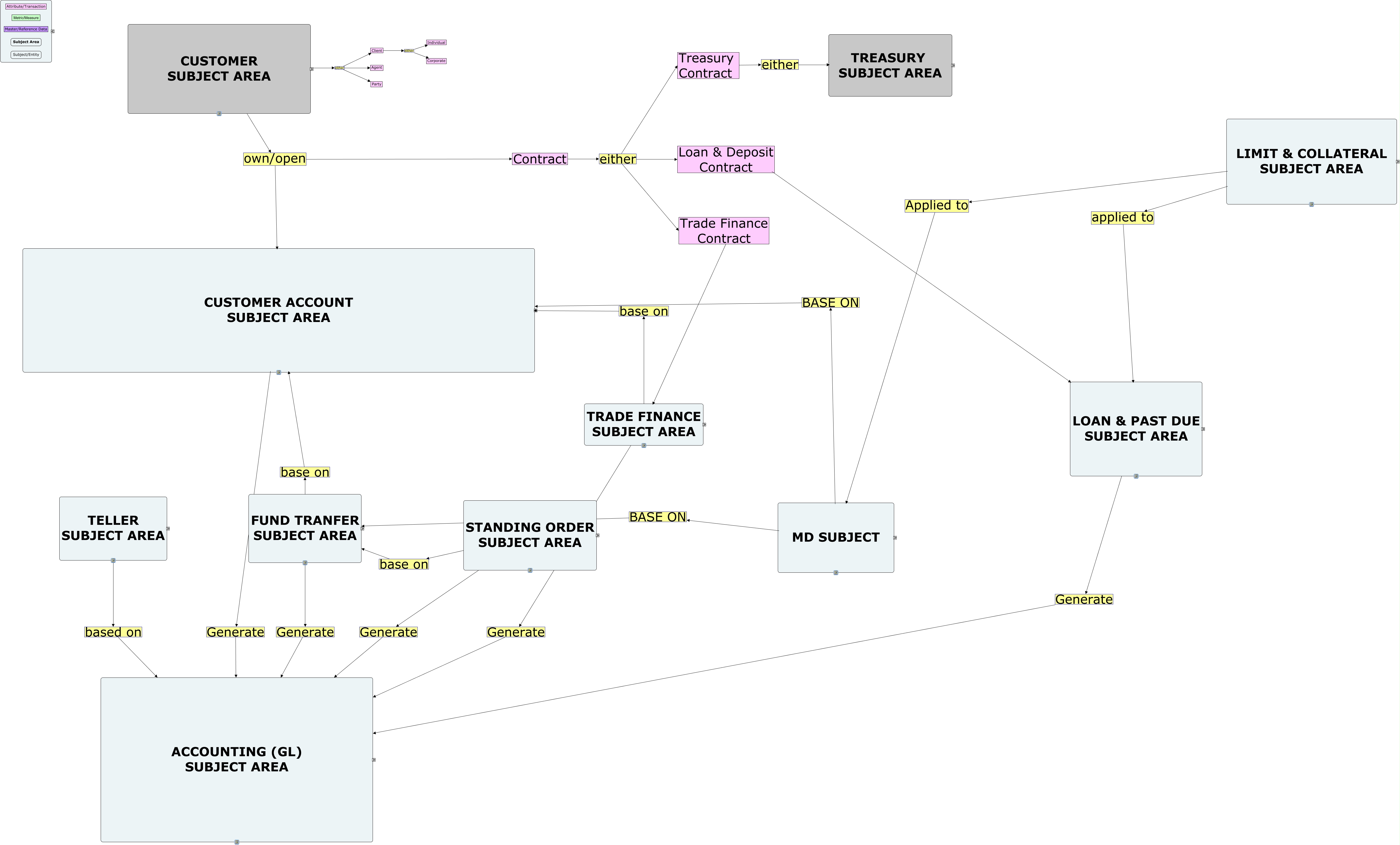 This Concept Map, created with IHMC CmapTools, has information related to: Banking Subject Area Design_LV1_ver064, IB Nhờ thu NK Has CHARGED EVENT, FUND TRANSFER use Debit currency Credit currency, ACCOUNTING EVENT generate ACCOUNTING EVENT Our reference Người làm Người duyệt Ngày giờ làm Ngày giờ duyệt Loại tiền Diễn giải giao dịch, DATE TIME contains Quí, CUSTOMER SUBJECT AREA own/open Contract, ACCOUNTING EVENT classifyed by Transaction Type, Org Legal Entity include Officer, Vostro Account of Customer (Other Bank), NON ACCOUNTING EVENT types Modify các thông tin khác (mục đích vay, org chart..), FUND TRANSFER link to CITAD, LIMIT type SubProduct Level, ACCOUNTTING (General Ledger) dimension TERM, LỊCH THAY ĐỔI LÃI SUẤT apply to Gốc Lãi Gốc quá hạn Lãi quá hạn, DATE TIME contains Năm, CUSTOMER ACCOUNT classify as ACCOUNT CUSTOMER CATEGORIES, MISCELLANEOUS DEALS has Open (deal) date value date maturity date Input deal date Expiry date Charge date, Org Legal Entity doing treasury biz Foreign Exchange, CUSTOMER ACCOUNT SUBJECT measured by Working Bal, CUSTOMER ACCOUNT SUBJECT has many ACCOUNTING EVENT, CUSTOMER ACCOUNT SUBJECT belong to CUSTOMER
