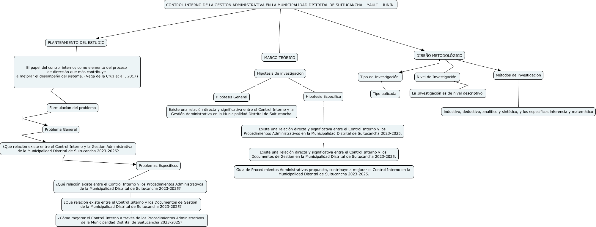Este Cmap, tiene información relacionada con: ARTICAIZAMAR, PLANTEAMIENTO DEL ESTUDIO El papel del control interno; como elemento del proceso de dirección que más contribuye a mejorar el desempeño del sistema. (Vega de la Cruz et al., 2017), DISEÑO METODOLÓGICO Nivel de Investigación, Existe una relación directa y significativa entre el Control Interno y los Documentos de Gestión en la Municipalidad Distrital de Suitucancha 2023-2025. Guía de Procedimientos Administrativos propuesta, contribuye a mejorar el Control Interno en la Municipalidad Distrital de Suitucancha 2023-2025., Formulación del problema Problema General, DISEÑO METODOLÓGICO Tipo de Investigación, ¿Qué relación existe entre el Control Interno y la Gestión Administrativa de la Municipalidad Distrital de Suitucancha 2023-2025? Problemas Específicos, DISEÑO METODOLÓGICO Métodos de investigación, CONTROL INTERNO DE LA GESTIÓN ADMINISTRATIVA EN LA MUNICIPALIDAD DISTRITAL DE SUITUCANCHA – YAULI – JUNÍN PLANTEAMIENTO DEL ESTUDIO, Hipótesis de investigación Hipótesis General, Problemas Específicos ¿Qué relación existe entre el Control Interno y los Procedimientos Administrativos de la Municipalidad Distrital de Suitucancha 2023-2025?, ¿Qué relación existe entre el Control Interno y los Documentos de Gestión de la Municipalidad Distrital de Suitucancha 2023-2025? ¿Cómo mejorar el Control Interno a través de los Procedimientos Administrativos de la Municipalidad Distrital de Suitucancha 2023-2025?, Hipótesis de investigación Hipótesis Especifica, Problema General ¿Qué relación existe entre el Control Interno y la Gestión Administrativa de la Municipalidad Distrital de Suitucancha 2023-2025?, Hipótesis General Existe una relación directa y significativa entre el Control Interno y la Gestión Administrativa en la Municipalidad Distrital de Suitucancha., ¿Qué relación existe entre el Control Interno y los Procedimientos Administrativos de la Municipalidad Distrital de Suitucancha 2023-2025? ¿Qué relación existe entre el Control Interno y los Documentos de Gestión de la Municipalidad Distrital de Suitucancha 2023-2025?, ¿Qué relación existe entre el Control Interno y los Procedimientos Administrativos de la Municipalidad Distrital de Suitucancha 2023-2025? ¿Qué relación existe entre el Control Interno y los Documentos de Gestión de la Municipalidad Distrital de Suitucancha 2023-2025?, Nivel de Investigación La Investigación es de nivel descriptivo., Hipótesis Especifica Existe una relación directa y significativa entre el Control Interno y los Procedimientos Administrativos en la Municipalidad Distrital de Suitucancha 2023-2025., Métodos de investigación inductivo, deductivo, analítico y sintético, y los específicos inferencia y matemático, CONTROL INTERNO DE LA GESTIÓN ADMINISTRATIVA EN LA MUNICIPALIDAD DISTRITAL DE SUITUCANCHA – YAULI – JUNÍN MARCO TEÓRICO