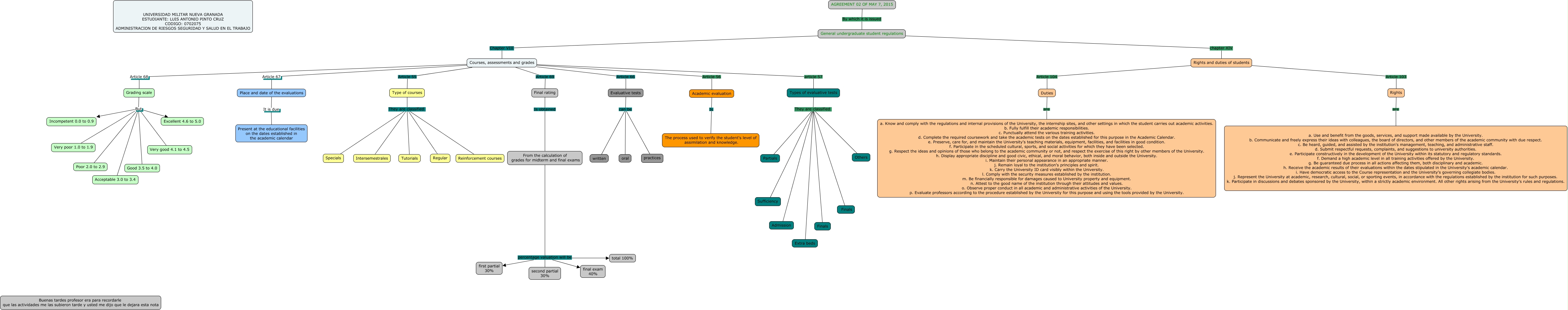 Este Cmap, tiene información relacionada con: mapa conceptual 1, Types of evaluative tests They are classified Others, Type of courses They are classified Intersemestrales, Evaluative tests can be oral, From the calculation of grades for midterm and final exams percentage valuation will be final exam 40%, General undergraduate student regulations chapter XIV Rights and duties of students, Grading scale But Acceptable 3.0 to 3.4, From the calculation of grades for midterm and final exams percentage valuation will be total 100%, Courses, assessments and grades Article 67 Place and date of the evaluations, Type of courses They are classified Reinforcement courses, Final rating Is obtained From the calculation of grades for midterm and final exams, Grading scale But Incompetent 0.0 to 0.9, Types of evaluative tests They are classified Sufficiency, Types of evaluative tests They are classified Partials, Courses, assessments and grades Article 68 Grading scale, Place and date of the evaluations It is due Present at the educational facilities on the dates established in the academic calendar, AGREEMENT 02 OF MAY 7, 2015 By which it is issued General undergraduate student regulations, Rights and duties of students Article 103 Rights, From the calculation of grades for midterm and final exams percentage valuation will be first partial 30%, Type of courses They are classified Tutorials, Types of evaluative tests They are classified Finals