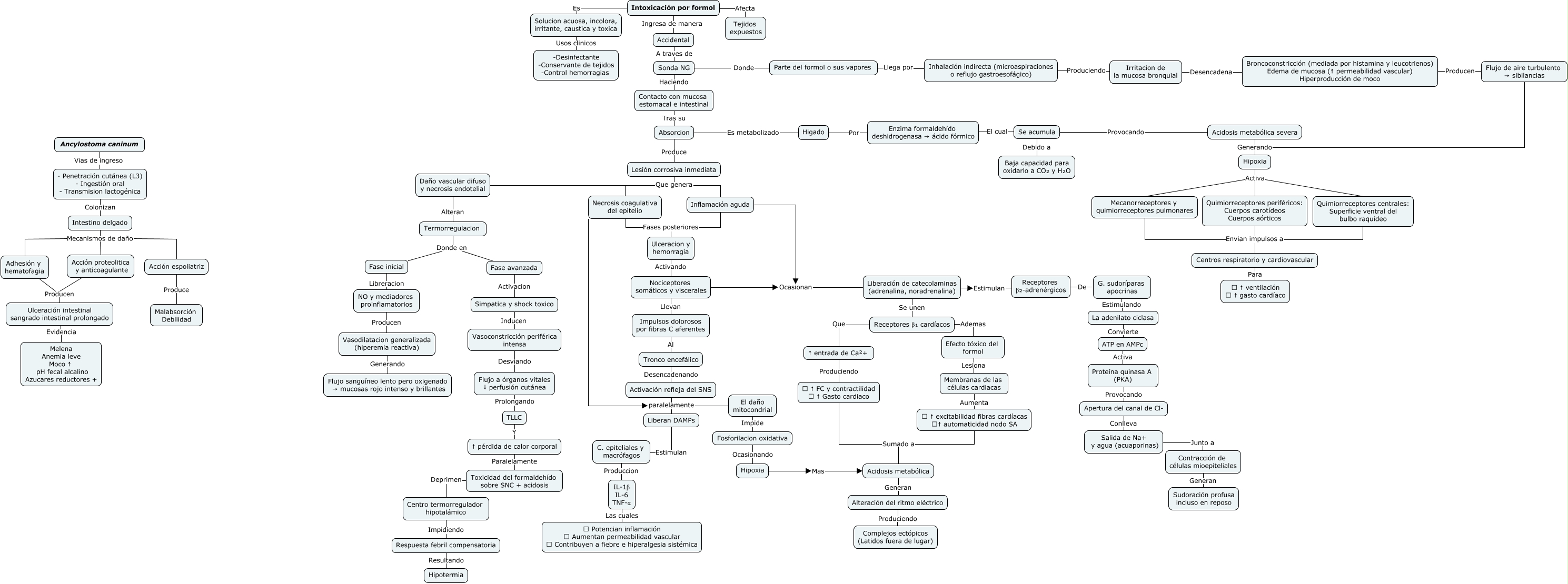 Este Cmap, tiene información relacionada con: Clinica I corregido, Centros respiratorio y cardiovascular Para ⮕ ↑ ventilación ⮕ ↑ gasto cardíaco, Lesión corrosiva inmediata Que genera Necrosis coagulativa del epitelio, Fase inicial Libreracion NO y mediadores proinflamatorios, Activación refleja del SNS paralelamente El daño mitocondrial, ⮕ ↑ FC y contractilidad ⮕ ↑ Gasto cardiaco Sumado a Acidosis metabólica, Liberación de catecolaminas (adrenalina, noradrenalina) Se unen Receptores β₁ cardíacos, Higado Por Enzima formaldehído deshidrogenasa → ácido fórmico, Intoxicación por formol Ingresa de manera Accidental, Absorcion Es metabolizado Higado, El daño mitocondrial Impide Fosforilacion oxidativa, Liberación de catecolaminas (adrenalina, noradrenalina) Estimulan Receptores β₂-adrenérgicos, Accidental A traves de Sonda NG, Vasodilatacion generalizada (hiperemia reactiva) Generando Flujo sanguíneo lento pero oxigenado → mucosas rojo intenso y brillantes, Proteína quinasa A (PKA) Provocando Apertura del canal de Cl-, Ulceración intestinal sangrado intestinal prolongado Evidencia Melena Anemia leve Moco ↑ pH fecal alcalino Azucares reductores +, Salida de Na+ y agua (acuaporinas) Junto a Contracción de células mioepiteliales, Quimiorreceptores centrales: Superficie ventral del bulbo raquídeo Envian impulsos a Centros respiratorio y cardiovascular, Hipoxia Activa Quimiorreceptores periféricos: Cuerpos carotídeos Cuerpos aórticos, ⮕ ↑ excitabilidad fibras cardíacas ↑ automaticidad nodo SA Sumado a Acidosis metabólica, Hipoxia Mas Acidosis metabólica