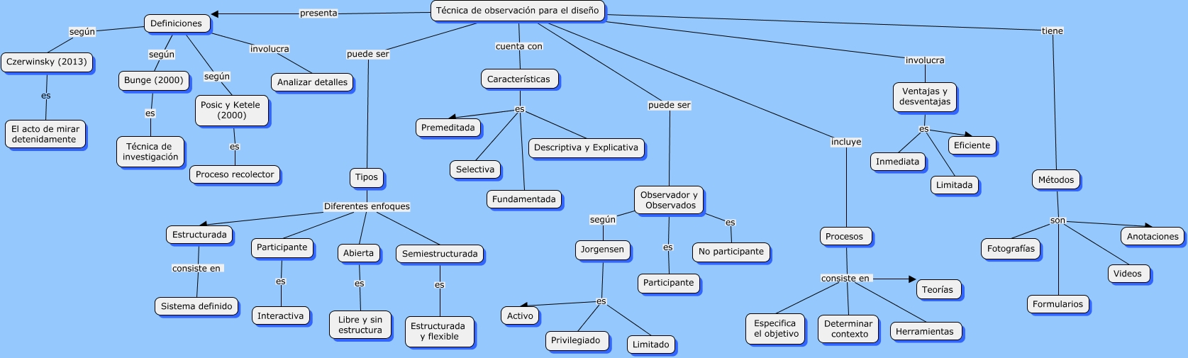Este Cmap, tiene información relacionada con: La observación, Procesos consiste en Determinar contexto, Tipos Diferentes enfoques Estructurada, Czerwinsky (2013) es El acto de mirar detenidamente, Semiestructurada es Estructurada y flexible, Ventajas y desventajas es Eficiente, Observador y Observados según Jorgensen, Métodos son Fotografías, Técnica de observación para el diseño involucra Ventajas y desventajas, Tipos Diferentes enfoques Semiestructurada, Métodos son Videos, Estructurada consiste en Sistema definido, Bunge (2000) es Técnica de investigación, Características es Selectiva, Características es Premeditada, Características es Descriptiva y Explicativa, Ventajas y desventajas es Limitada, Definiciones según Bunge (2000), Técnica de observación para el diseño incluye Procesos, Jorgensen es Activo, Abierta es Libre y sin estructura