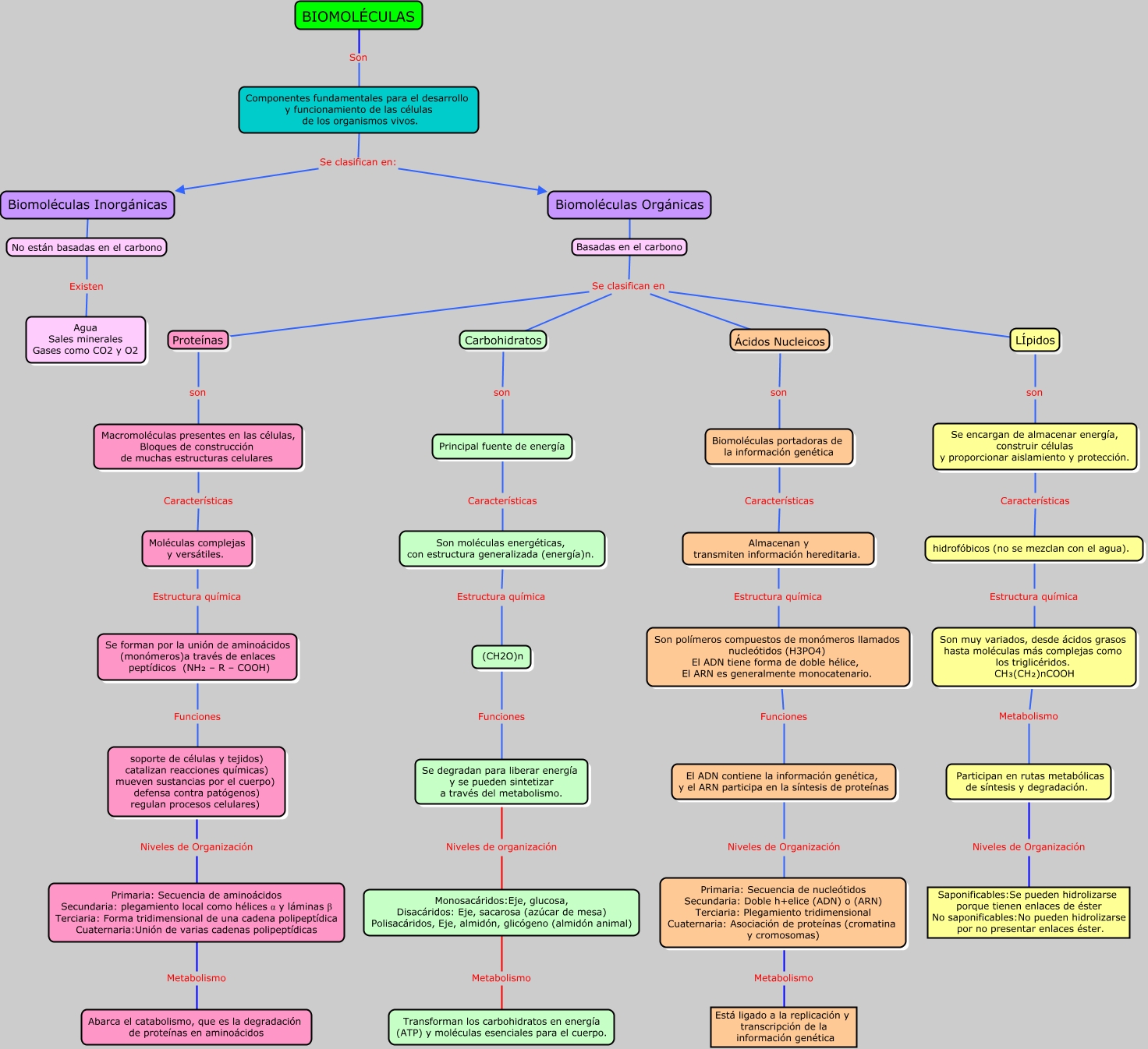 Este Cmap, tiene información relacionada con: MAPA CONCEPTUAL, Primaria: Secuencia de aminoácidos Secundaria: plegamiento local como hélices α y láminas β Terciaria: Forma tridimensional de una cadena polipeptídica Cuaternaria:Unión de varias cadenas polipeptídicas Metabolismo, El ADN contiene la información genética, y el ARN participa en la síntesis de proteínas Niveles de Organización, Niveles de Organización Saponificables:Se pueden hidrolizarse porque tienen enlaces de éster No saponificables:No pueden hidrolizarse por no presentar enlaces éster., Metabolismo Transforman los carbohidratos en energía (ATP) y moléculas esenciales para el cuerpo., Estructura química Son muy variados, desde ácidos grasos hasta moléculas más complejas como los triglicéridos. CH₃(CH₂)nCOOH, (CH2O)n Funciones, Macromoléculas presentes en las células, Bloques de construcción de muchas estructuras celulares Características, son Macromoléculas presentes en las células, Bloques de construcción de muchas estructuras celulares, Estructura química (CH2O)n, Se clasifican en Ácidos Nucleicos son, Estructura química Son polímeros compuestos de monómeros llamados nucleótidos (H3PO4) El ADN tiene forma de doble hélice, El ARN es generalmente monocatenario., Se clasifican en LÍpidos son, Se encargan de almacenar energía, construir células y proporcionar aislamiento y protección. Características, Existen Agua Sales minerales Gases como CO2 y O2, Participan en rutas metabólicas de síntesis y degradación. Niveles de Organización, Funciones Se degradan para liberar energía y se pueden sintetizar a través del metabolismo., Se clasifican en Proteínas son, Características Almacenan y transmiten información hereditaria., Se clasifican en Carbohidratos son, Características Son moléculas energéticas, con estructura generalizada (energía)n.