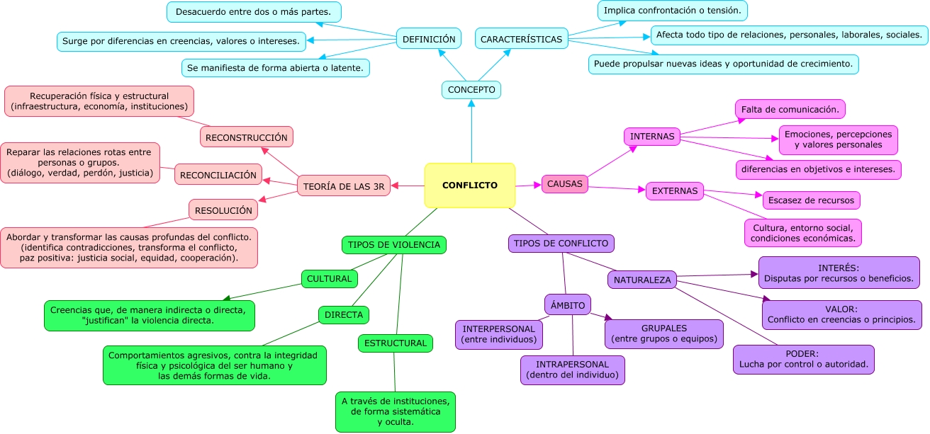 Este Cmap, tiene información relacionada con: CONFLICTO, CONFLICTO ???? TIPOS DE VIOLENCIA, CONFLICTO ???? TEORÍA DE LAS 3R, NATURALEZA ???? PODER: Lucha por control o autoridad., DEFINICIÓN ???? Surge por diferencias en creencias, valores o intereses., DEFINICIÓN ???? Desacuerdo entre dos o más partes., CARACTERÍSTICAS ???? Afecta todo tipo de relaciones, personales, laborales, sociales., TEORÍA DE LAS 3R ???? RESOLUCIÓN, TEORÍA DE LAS 3R ???? RECONSTRUCCIÓN, CARACTERÍSTICAS ???? Implica confrontación o tensión., CONFLICTO ???? CAUSAS, CONFLICTO ???? CONCEPTO, RECONSTRUCCIÓN ???? Recuperación física y estructural (infraestructura, economía, instituciones), NATURALEZA ???? TIPOS DE CONFLICTO, INTERNAS ???? diferencias en objetivos e intereses., TIPOS DE VIOLENCIA ???? DIRECTA, TIPOS DE CONFLICTO ???? ÁMBITO, RESOLUCIÓN ???? Abordar y transformar las causas profundas del conflicto. (identifica contradicciones, transforma el conflicto, paz positiva: justicia social, equidad, cooperación)., CONCEPTO ???? CARACTERÍSTICAS, DIRECTA ???? Comportamientos agresivos, contra la integridad física y psicológica del ser humano y las demás formas de vida., ÁMBITO ???? INTERPERSONAL (entre individuos)