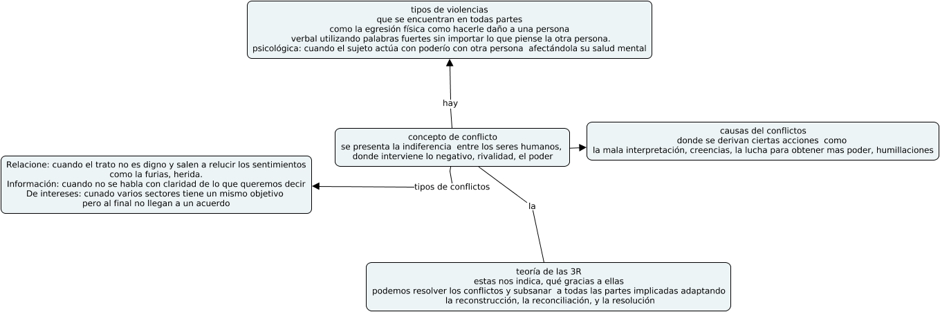 This Concept Map, created with IHMC CmapTools, has information related to: Cmap-0, concepto de conflicto se presenta la indiferencia entre los seres humanos, donde interviene lo negativo, rivalidad, el poder hay tipos de violencias que se encuentran en todas partes como la egresión física como hacerle daño a una persona verbal utilizando palabras fuertes sin importar lo que piense la otra persona. psicológica: cuando el sujeto actúa con poderío con otra persona afectándola su salud mental, concepto de conflicto se presenta la indiferencia entre los seres humanos, donde interviene lo negativo, rivalidad, el poder tipos de conflictos Relacione: cuando el trato no es digno y salen a relucir los sentimientos como la furias, herida. Información: cuando no se habla con claridad de lo que queremos decir De intereses: cunado varios sectores tiene un mismo objetivo pero al final no llegan a un acuerdo, concepto de conflicto se presenta la indiferencia entre los seres humanos, donde interviene lo negativo, rivalidad, el poder la teoría de las 3R estas nos indica, qué gracias a ellas podemos resolver los conflictos y subsanar a todas las partes implicadas adaptando la reconstrucción, la reconciliación, y la resolución, concepto de conflicto se presenta la indiferencia entre los seres humanos, donde interviene lo negativo, rivalidad, el poder ???? causas del conflictos donde se derivan ciertas acciones como la mala interpretación, creencias, la lucha para obtener mas poder, humillaciones