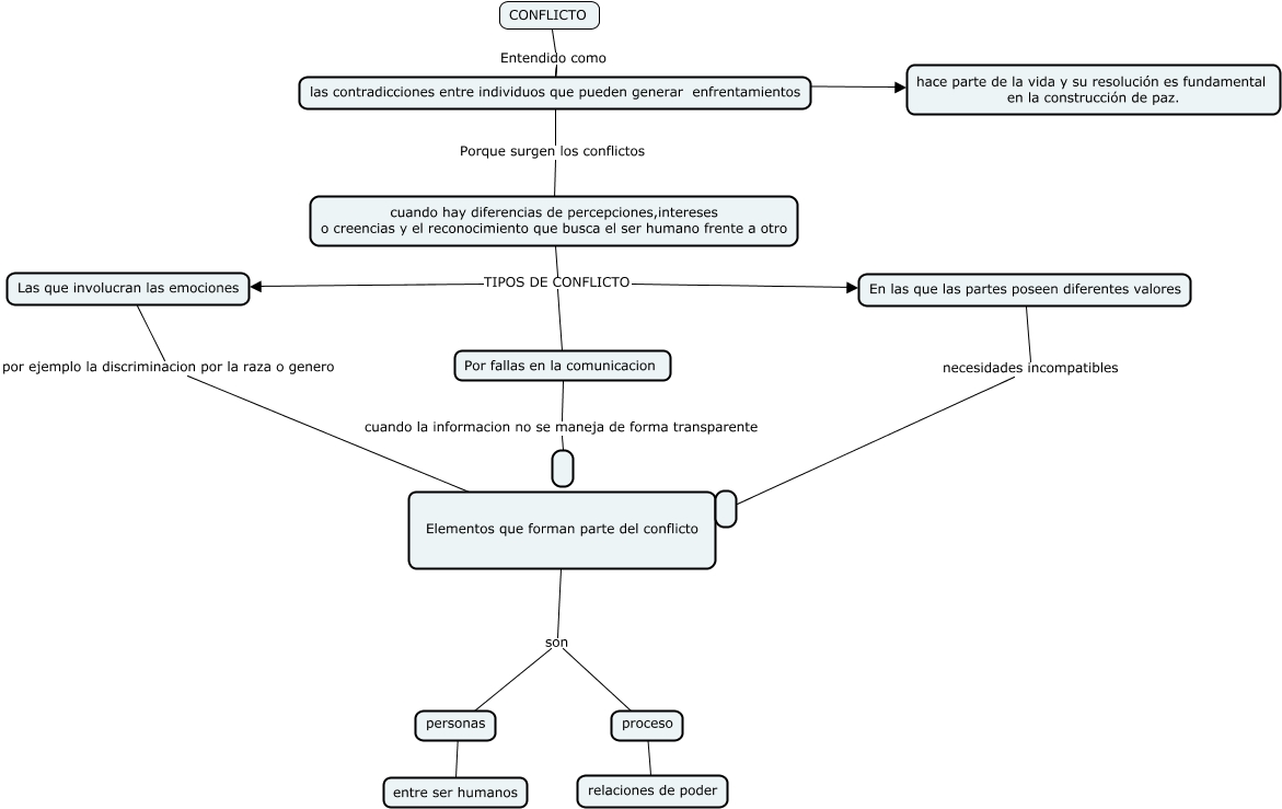 Este Cmap, tiene información relacionada con: conflicto, Elementos que forman parte del conflicto son proceso, Elementos que forman parte del conflicto son personas, las contradicciones entre individuos que pueden generar enfrentamientos Porque surgen los conflictos cuando hay diferencias de percepciones,intereses o creencias y el reconocimiento que busca el ser humano frente a otro, Por fallas en la comunicacion cuando la informacion no se maneja de forma transparente, cuando hay diferencias de percepciones,intereses o creencias y el reconocimiento que busca el ser humano frente a otro TIPOS DE CONFLICTO En las que las partes poseen diferentes valores, proceso ???? relaciones de poder, CONFLICTO Entendido como las contradicciones entre individuos que pueden generar enfrentamientos, En las que las partes poseen diferentes valores necesidades incompatibles, personas ???? entre ser humanos, Las que involucran las emociones por ejemplo la discriminacion por la raza o genero Elementos que forman parte del conflicto, cuando hay diferencias de percepciones,intereses o creencias y el reconocimiento que busca el ser humano frente a otro TIPOS DE CONFLICTO Las que involucran las emociones, las contradicciones entre individuos que pueden generar enfrentamientos ???? hace parte de la vida y su resolución es fundamental en la construcción de paz., cuando hay diferencias de percepciones,intereses o creencias y el reconocimiento que busca el ser humano frente a otro TIPOS DE CONFLICTO Por fallas en la comunicacion