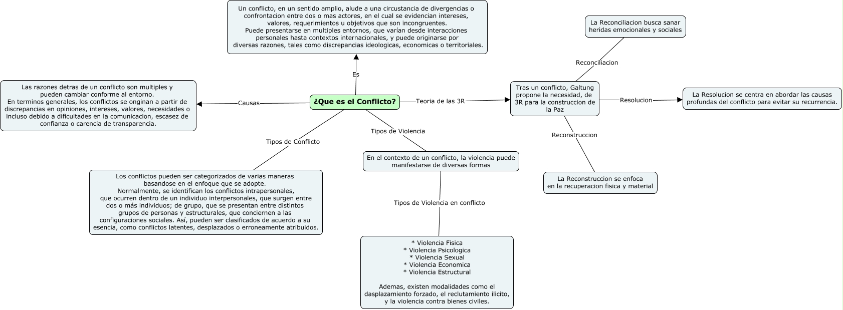 Este Cmap, tiene información relacionada con: El Conflicto, ¿Que es el Conflicto? Teoria de las 3R Tras un conflicto, Galtung propone la necesidad, de 3R para la construccion de la Paz, Tras un conflicto, Galtung propone la necesidad, de 3R para la construccion de la Paz Resolucion La Resolucion se centra en abordar las causas profundas del conflicto para evitar su recurrencia., ¿Que es el Conflicto? Causas Las razones detras de un conflicto son multiples y pueden cambiar conforme al entorno. En terminos generales, los conflictos se onginan a partir de discrepancias en opiniones, intereses, valores, necesidades o incluso debido a dificultades en la comunicacion, escasez de confianza o carencia de transparencia., Tras un conflicto, Galtung propone la necesidad, de 3R para la construccion de la Paz Reconstruccion La Reconstruccion se enfoca en la recuperacion fisica y material, En el contexto de un conflicto, la violencia puede manifestarse de diversas formas Tipos de Violencia en conflicto * Violencia Fisica * Violencia Psicologica * Violencia Sexual * Violencia Economica * Violencia Estructural Ademas, existen modalidades como el dasplazamiento forzado, el reclutamiento ilicito, y la violencia contra bienes civiles., La Reconciliacion busca sanar heridas emocionales y sociales Reconciliacion Tras un conflicto, Galtung propone la necesidad, de 3R para la construccion de la Paz, ¿Que es el Conflicto? Tipos de Violencia En el contexto de un conflicto, la violencia puede manifestarse de diversas formas, ¿Que es el Conflicto? Es Un conflicto, en un sentido amplio, alude a una circustancia de divergencias o confrontacion entre dos o mas actores, en el cual se evidencian intereses, valores, requerimientos u objetivos que son incongruentes. Puede presentarse en multiples entornos, que varían desde interacciones personales hasta contextos internacionales, y puede originarse por diversas razones, tales como discrepancias ideologicas, economicas o territoriales., ¿Que es el Conflicto? Tipos de Conflicto Los conflictos pueden ser categorizados de varias maneras basandose en el enfoque que se adopte. Normalmente, se identifican los conflictos intrapersonales, que ocurren dentro de un individuo interpersonales, que surgen entre dos o más individuos; de grupo, que se presentan entre distintos grupos de personas y estructurales, que conciernen a las configuraciones sociales. Así, pueden ser clasificados de acuerdo a su esencia, como conflictos latentes, desplazados o erroneamente atribuidos.