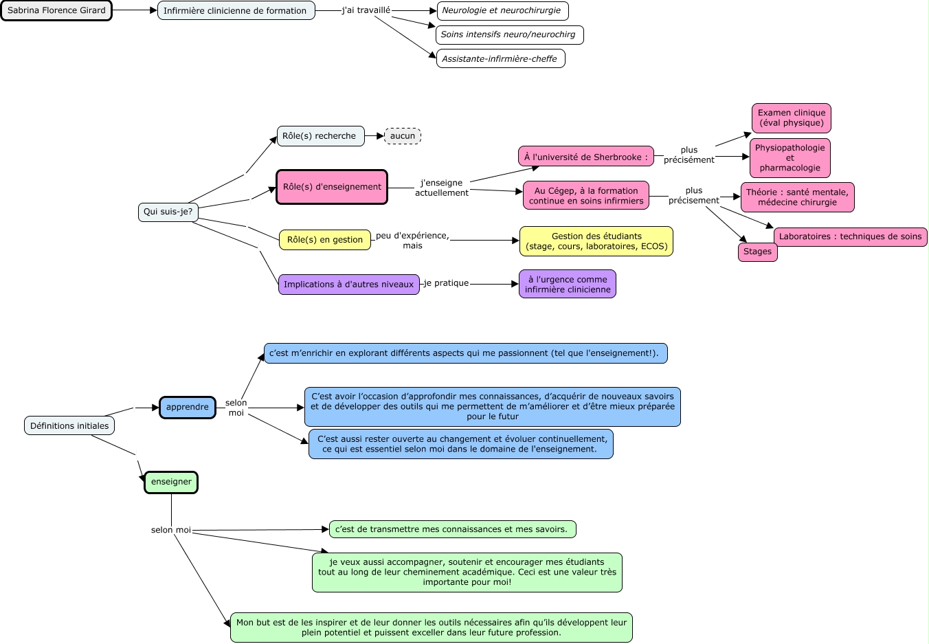 Cette carte de concepts créée avec IHMC CmapTools traite de: Présentation_SF_Girard, Qui suis-je? Rôle(s) en gestion, À l'université de Sherbrooke : plus précisément Physiopathologie et pharmacologie, Définitions initiales enseigner, enseigner selon moi c’est de transmettre mes connaissances et mes savoirs., Sabrina Florence Girard ???? Infirmière clinicienne de formation, apprendre selon moi c’est m’enrichir en explorant différents aspects qui me passionnent (tel que l'enseignement!)., Infirmière clinicienne de formation j'ai travaillé Assistante-infirmière-cheffe, Rôle(s) d'enseignement j'enseigne actuellement Au Cégep, à la formation continue en soins infirmiers, Au Cégep, à la formation continue en soins infirmiers plus précisement Stages, Qui suis-je? Implications à d'autres niveaux, apprendre selon moi C’est aussi rester ouverte au changement et évoluer continuellement, ce qui est essentiel selon moi dans le domaine de l'enseignement., Définitions initiales apprendre, Au Cégep, à la formation continue en soins infirmiers plus précisement Théorie : santé mentale, médecine chirurgie, Qui suis-je? Rôle(s) d'enseignement, Rôle(s) en gestion peu d'expérience, mais Gestion des étudiants (stage, cours, laboratoires, ECOS), apprendre selon moi C’est avoir l’occasion d’approfondir mes connaissances, d’acquérir de nouveaux savoirs et de développer des outils qui me permettent de m’améliorer et d’être mieux préparée pour le futur, Implications à d'autres niveaux je pratique à l'urgence comme infirmière clinicienne, enseigner selon moi je veux aussi accompagner, soutenir et encourager mes étudiants tout au long de leur cheminement académique. Ceci est une valeur très importante pour moi!, enseigner selon moi Mon but est de les inspirer et de leur donner les outils nécessaires afin qu’ils développent leur plein potentiel et puissent exceller dans leur future profession., Rôle(s) recherche ???? aucun