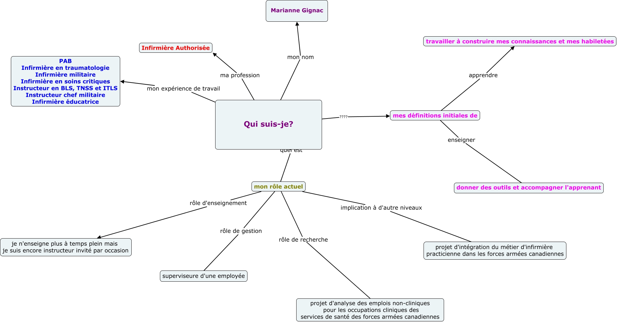This Concept Map, created with IHMC CmapTools, has information related to: Presentation_MGignac, Qui suis-je? ma profession Infirmière Authorisée, mes définitions initiales de apprendre travailler à construire mes connaissances et mes habiletées, mon rôle actuel rôle de recherche projet d'analyse des emplois non-cliniques pour les occupations cliniques des services de santé des forces armées canadiennes, Qui suis-je? mon nom Marianne Gignac, Qui suis-je? quel est mon rôle actuel, Qui suis-je? ???? mes définitions initiales de, Qui suis-je? mon expérience de travail PAB Infirmière en traumatologie Infirmière militaire Infirmière en soins critiques Instructeur en BLS, TNSS et ITLS Instructeur chef militaire Infirmière éducatrice, mon rôle actuel rôle d'enseignement je n'enseigne plus à temps plein mais je suis encore instructeur invité par occasion, mon rôle actuel rôle de gestion superviseure d'une employée, mes définitions initiales de enseigner donner des outils et accompagner l'apprenant, mon rôle actuel implication à d'autre niveaux projet d'intégration du métier d'infirmière practicienne dans les forces armées canadiennes