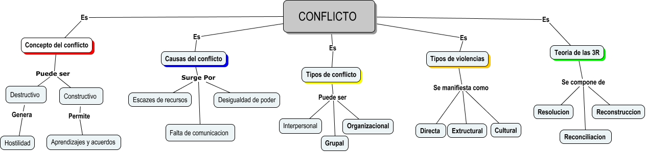 Este Cmap, tiene información relacionada con: MAPA CONCEPTUAL SOBRE EL CONFLICTO, Concepto del conflicto Puede ser Destructivo, Teoria de las 3R Se compone de Resolucion, CONFLICTO Es Tipos de violencias, Tipos de violencias Se manifiesta como Extructural, Tipos de conflicto Puede ser Interpersonal, CONFLICTO Es Teoria de las 3R, Constructivo Permite Aprendizajes y acuerdos, Tipos de violencias Se manifiesta como Cultural, CONFLICTO Es Tipos de conflicto, Causas del conflicto Surge Por Desigualdad de poder, CONFLICTO Es Concepto del conflicto, Causas del conflicto Surge Por Escazes de recursos, Concepto del conflicto Puede ser Constructivo, Destructivo Genera Hostilidad, Tipos de conflicto Puede ser Organizacional, Tipos de violencias Se manifiesta como Directa, Teoria de las 3R Se compone de Reconciliacion, Tipos de conflicto Puede ser Grupal, Causas del conflicto Surge Por Falta de comunicacion, Teoria de las 3R Se compone de Reconstruccion